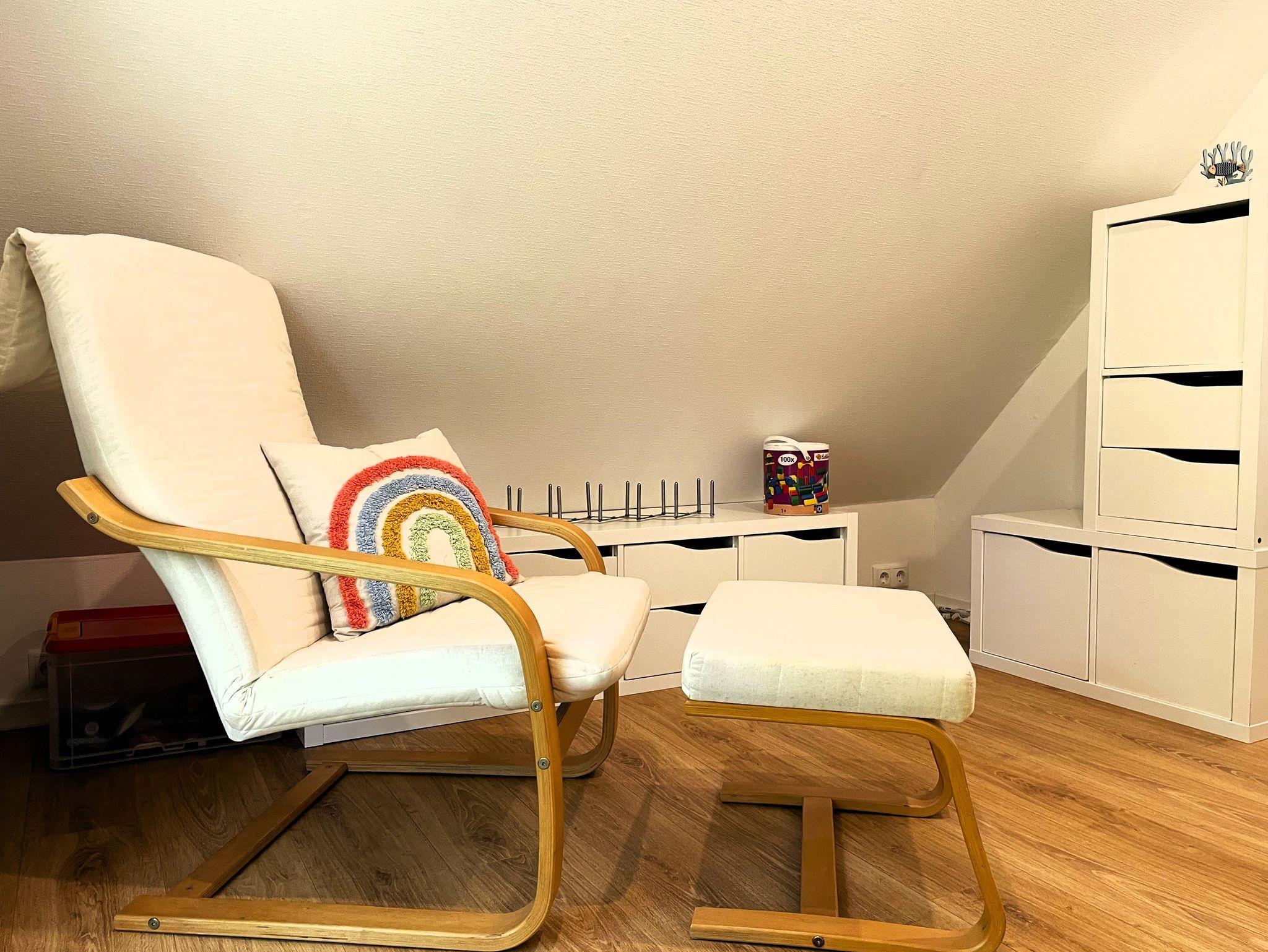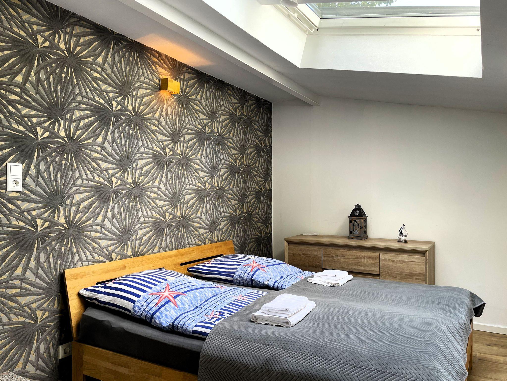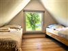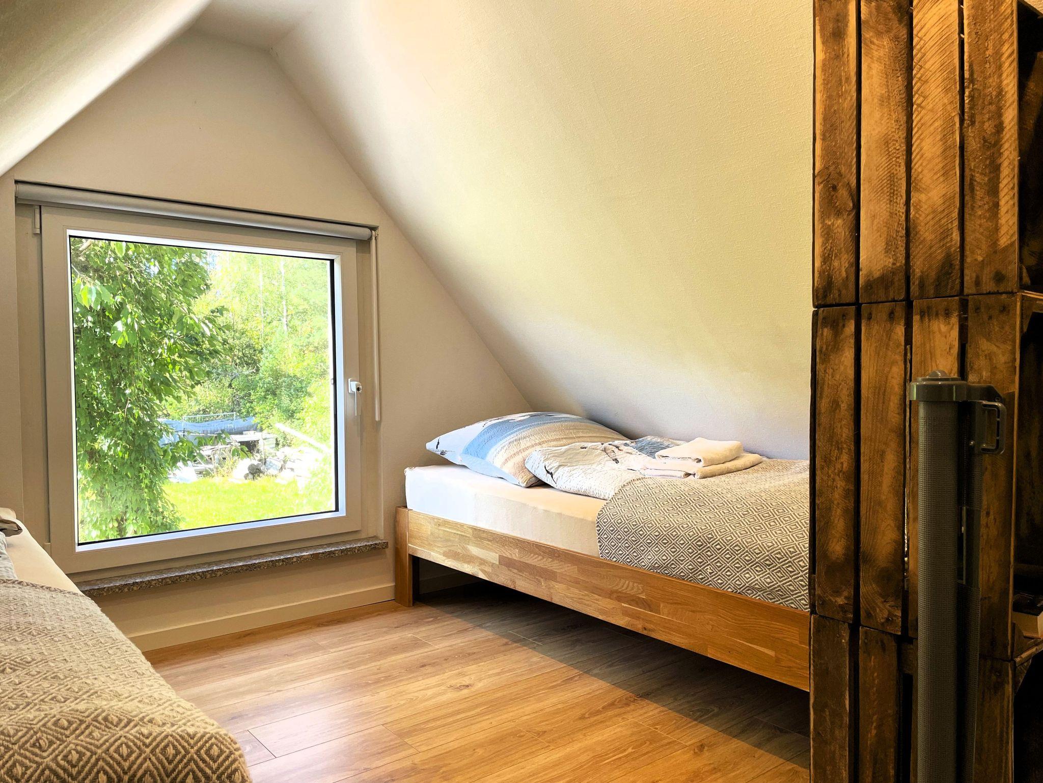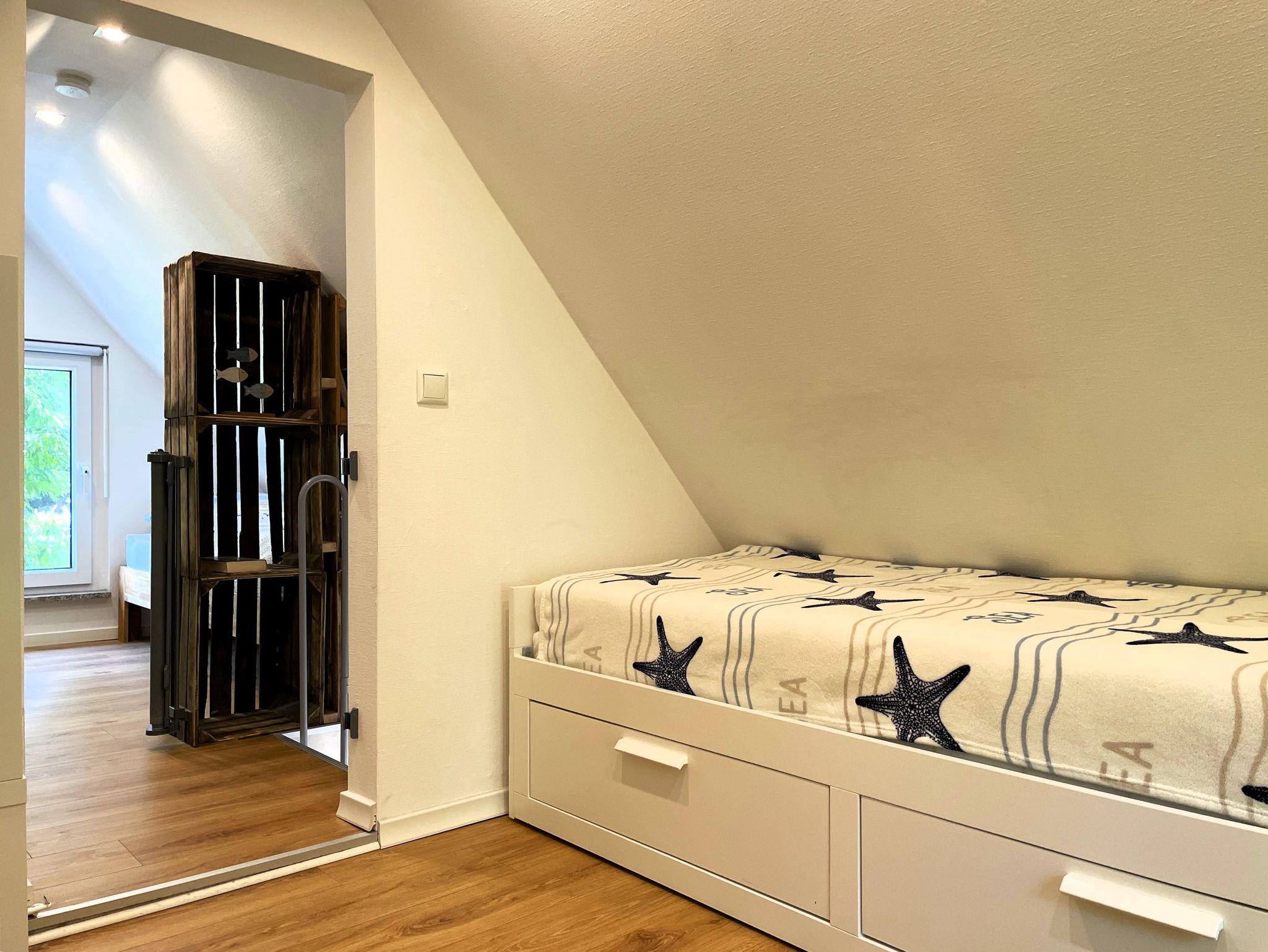 Eine Wendeltreppe führt ins Dachgeschoss, wo zwei getrennt stehende Betten sowie ein zusätzlicher Bereich auf Sie warten ob als Kinderzimmer, kleine Spielecke oder ruhiger Platz zum Lesen und Ausruhen.