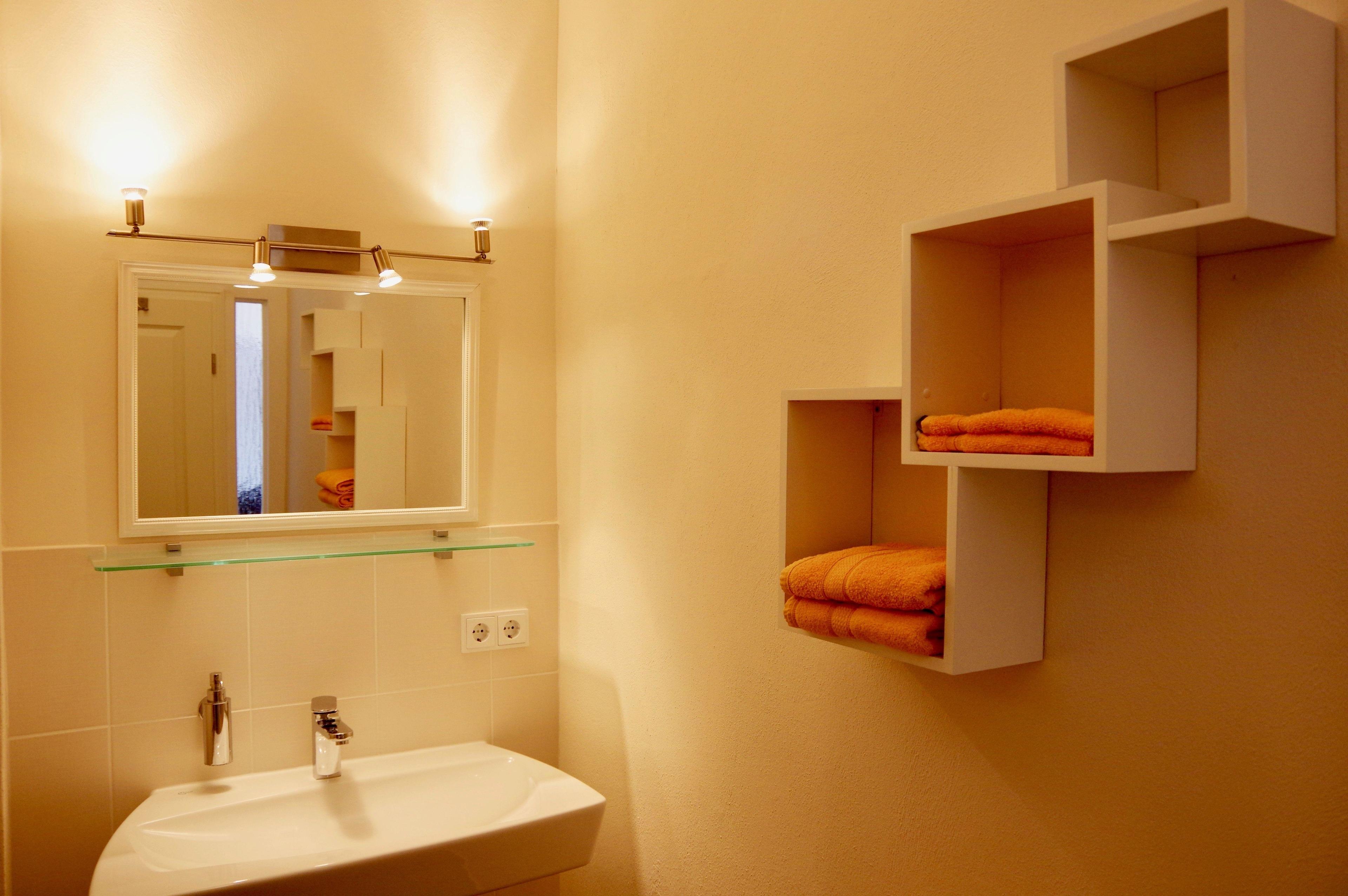 Das Bad ist mit einer überaus großen Dusche und einem Waschtisch in besonderem Design ausgestattet.