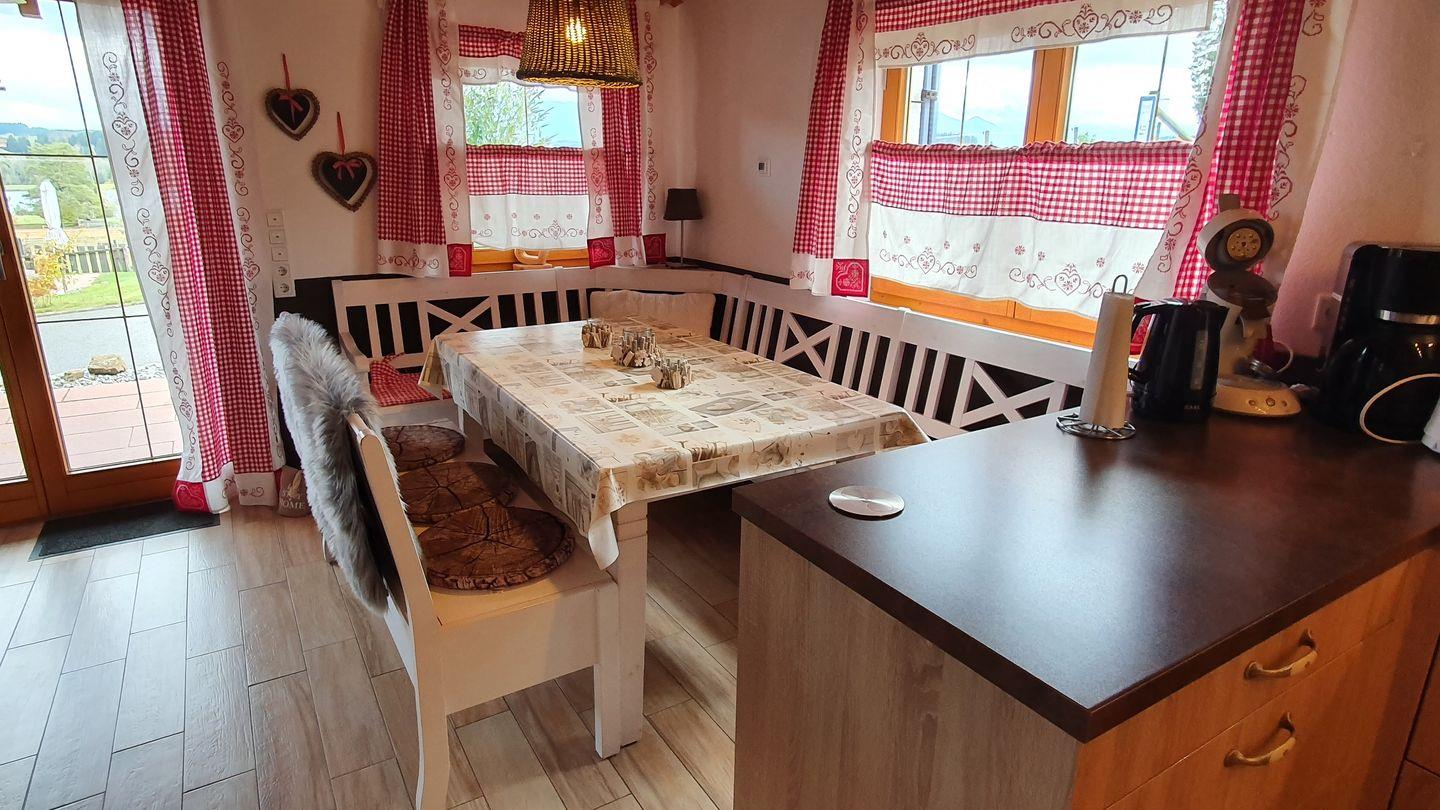 Die offene Küche ist mit hochwertigen Geräten ausgestattet und lässt keine Wünsche offen: Ob Kochgemeinschaft mit Familie oder das Zubereiten eines romantischen Abendessens – hier finden Sie alles von Ceran-Kochfeld über Backofen bis hin zur Spülmaschine. Der angrenzende Essbereich ist der perfekte Ort, um gemeinsam zu speisen und die Erlebnisse des Tages auszutauschen.