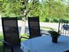 Die Süd-Terrasse ist möbliert mit einem Gartentisch und Stühlen, zwei Sonnenliegen und Markise.