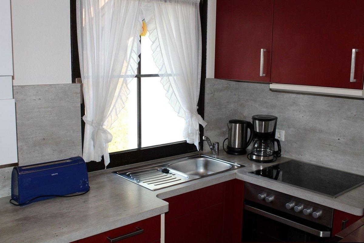 • Eine komplett ausgestattete Küche mit Spülmaschine, Kühlschrank (mit Gefrierfach), Mikrowelle, Kaffeemaschine, Wasserkocher, Toaster, ausreichend Geschirr, usw. ist vorhanden.