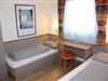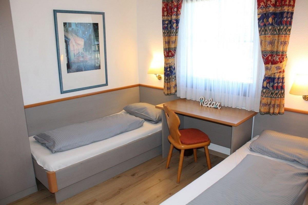Hier befinden sich zwei Einzelbetten, ein Schreibtisch und ein Kleiderschrank
