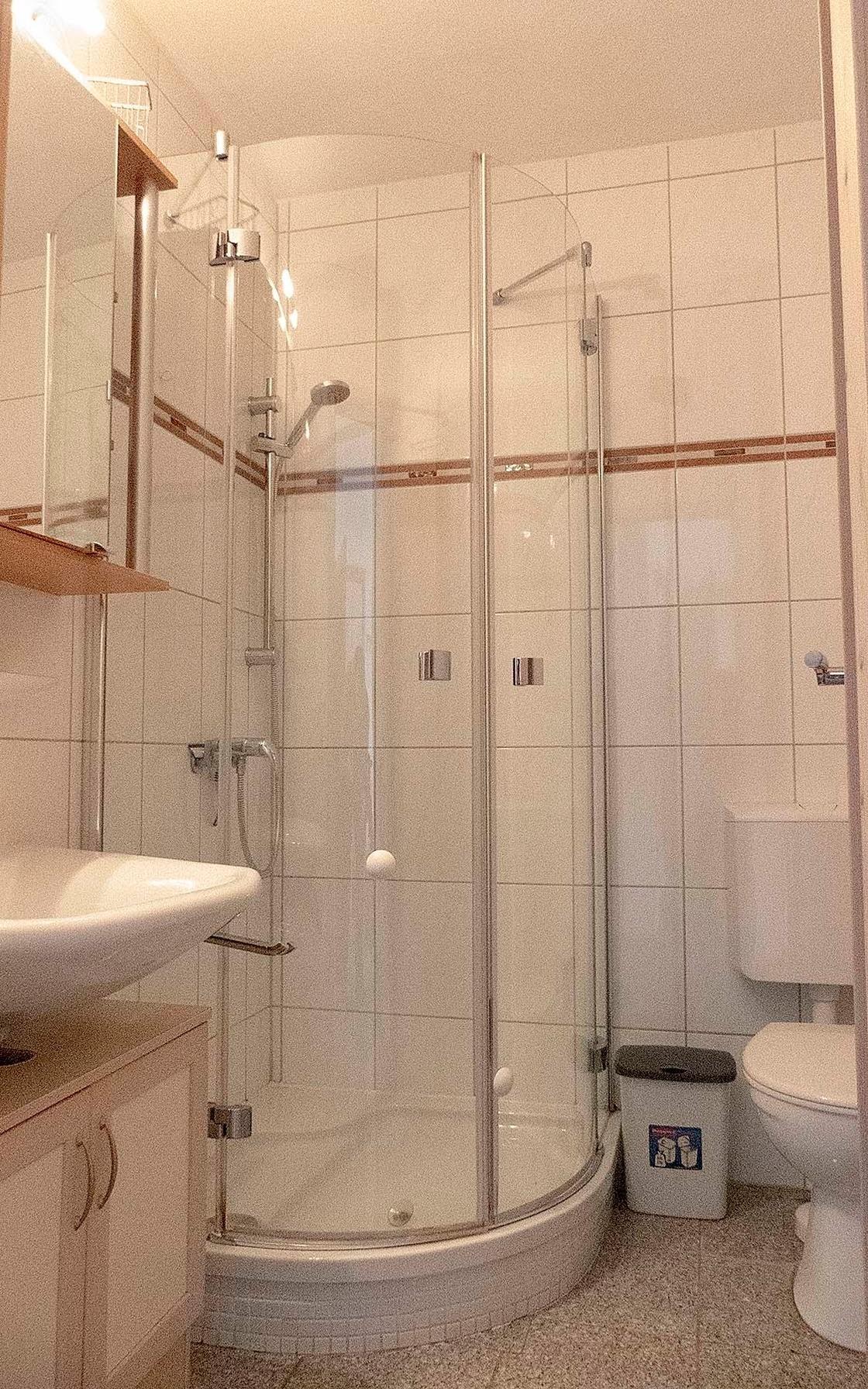 Das Duschbad bietet eine 90 cm Runddusche, Handtuchheizkörper und großen Spiegelschrank.