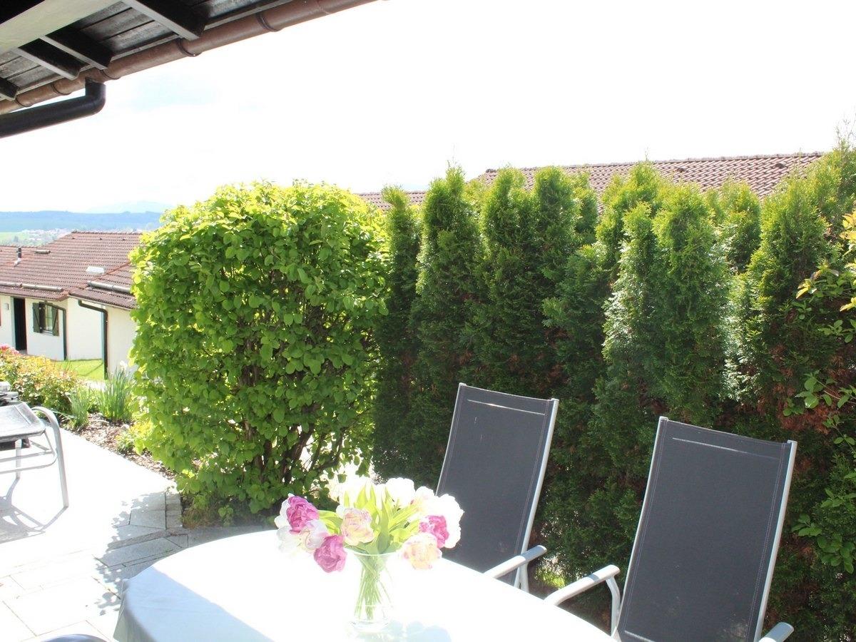 Die Süd-Terrasse ist möbliert mit einem Gartentisch und Stühlen, sowie zwei Sonnenliegen. Ein Sonnenschirm kann an der Rezeption ausgeliehen werden.