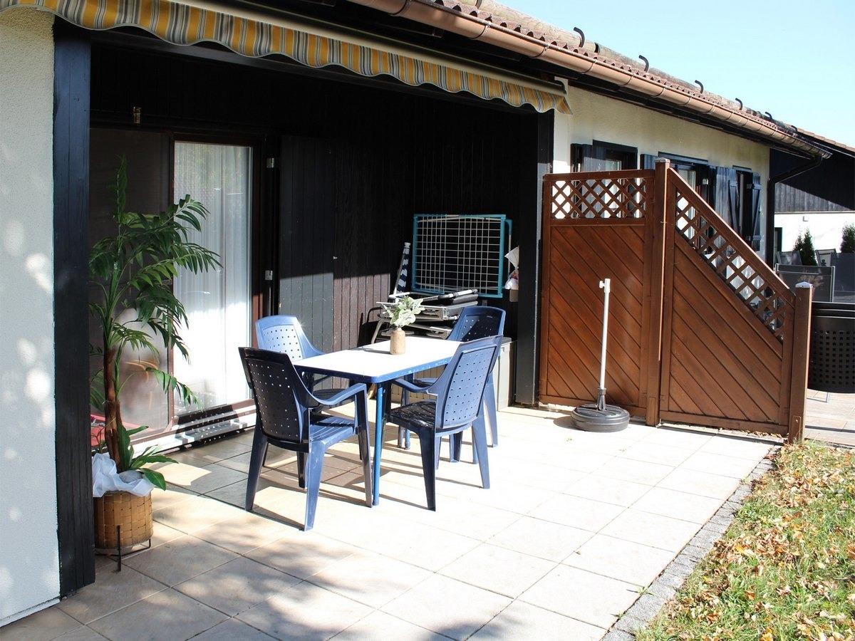 1 große Süd-Terrasse mit Gartenmöbeln, Markise und 2 Liegestühlen