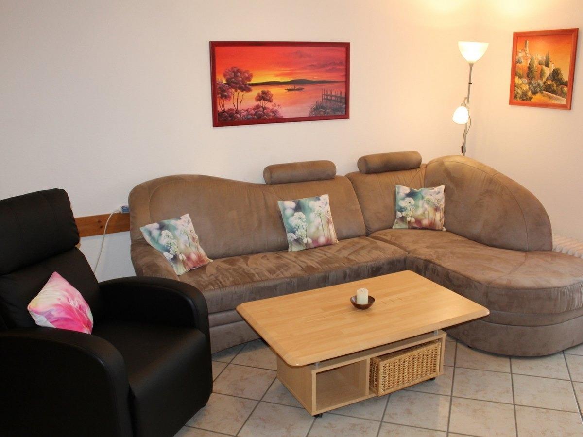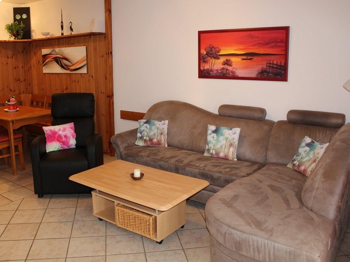 Gemütliches Wohnzimmer mit Essecke, Eckcouch, Fernsehsessel, LCD Fernseher 107 cm (HDMI Anschluss für Ihr Smartphone etc., Sie müssen nur das entsprechende Kabel mitbringen), Radio