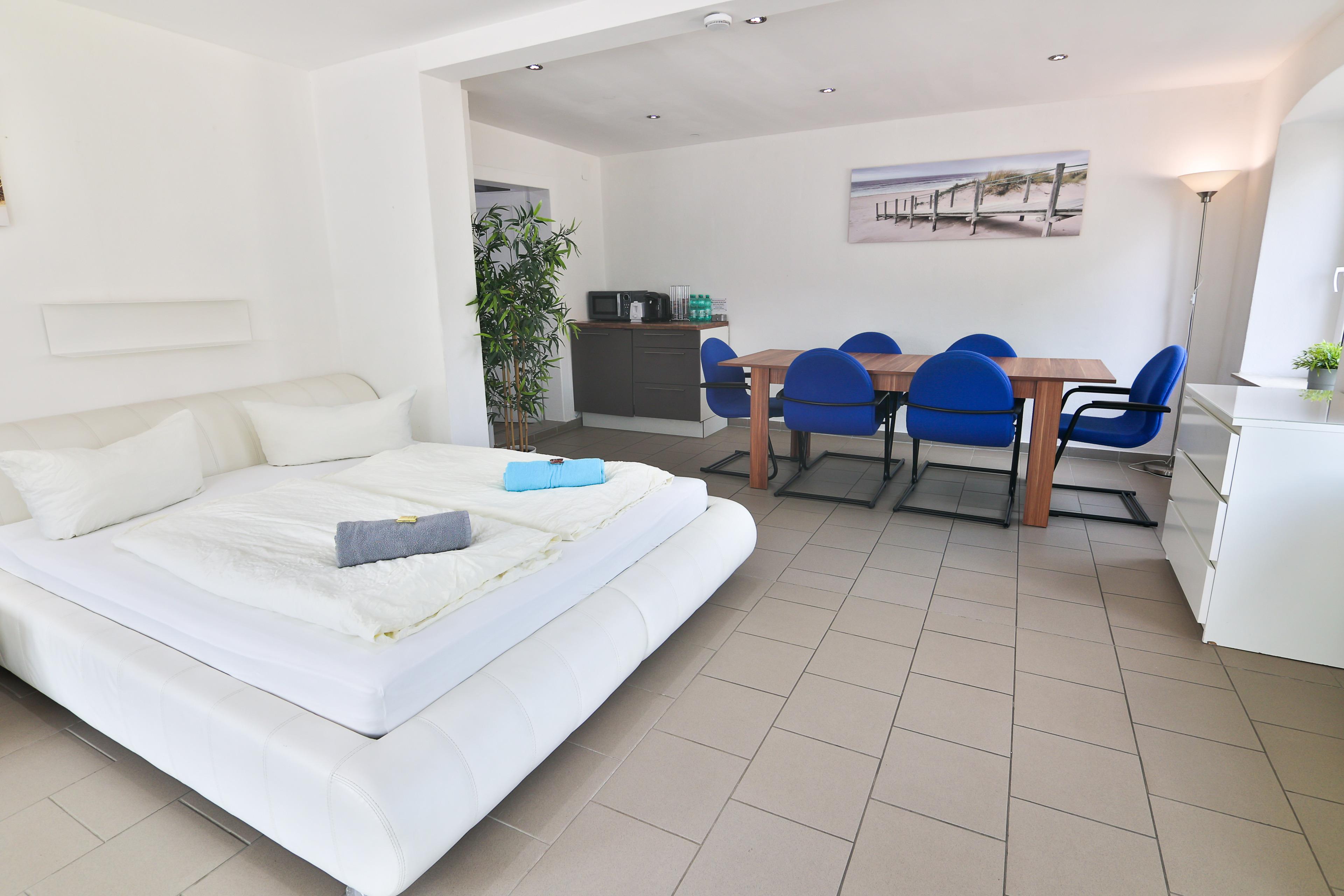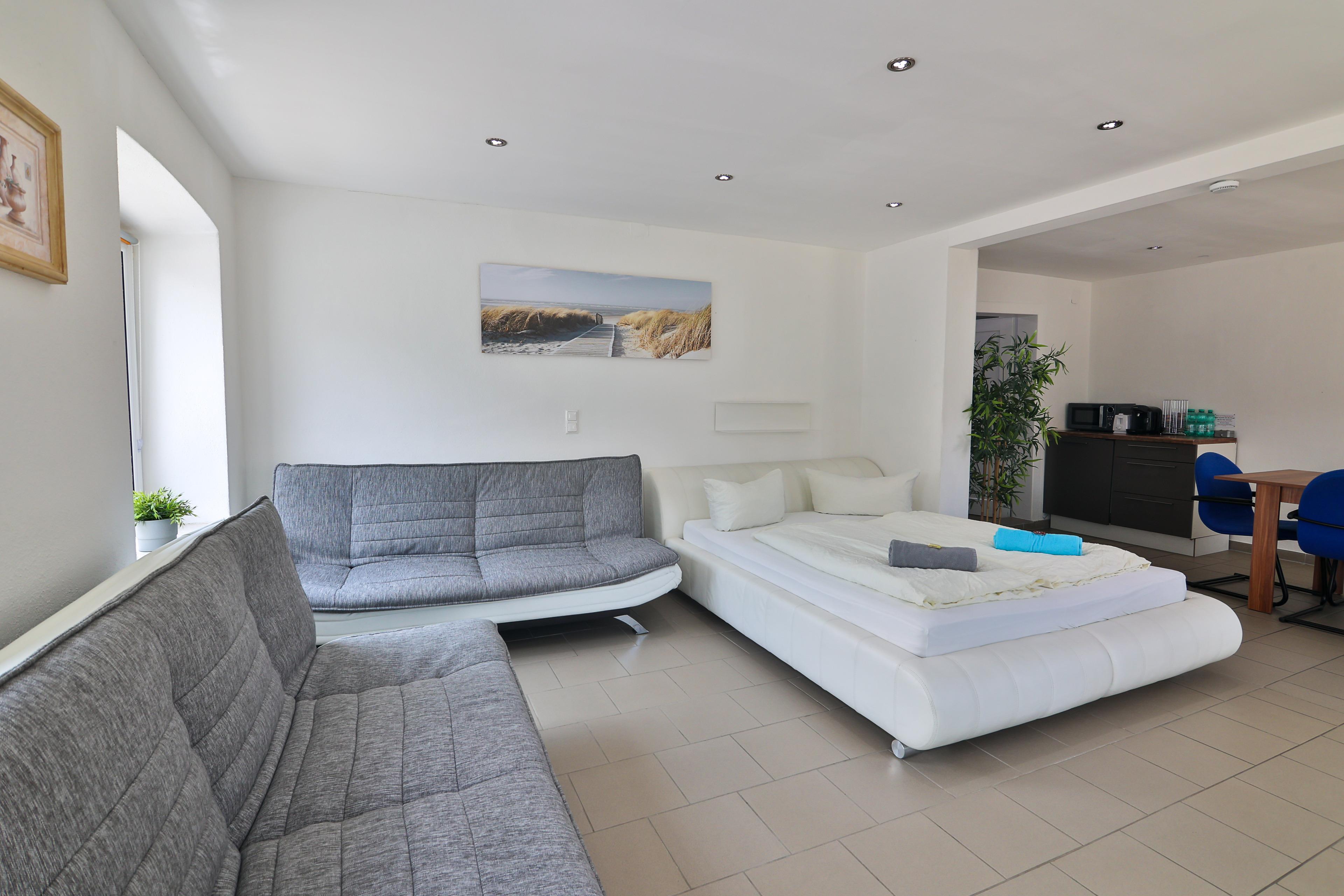 Im Schlafzimmer befinden sich ein 2 er und ein 3 er Etagenbetten , die auch für Erwachsene geeignet sind und Platz für 5 Personen bieten. In dem Zimmer gibt es dann auch noch ein gemütliches Federkern-Schlafsofa. Dieses Schlafzimmer verfügt über einen eigenen Eingang zum Innenhof. Des Weiteren gibt es einen geräumigen Funktionsraum mit einer großen Sitzgruppe zum Essen und Verweilen. In diesem Raum steht zudem ein riesiges King-Size Doppel-Lederbett zur Verfügung, dessen Bettzeug tagsüber im darunter liegenden Bettkasten verstaut werden kann. Zwei bequeme Federkern-Schlafsofas bieten sowohl Wohn- als auch Schlafkomfort. Zwischen den Räumen befindet sich eine voll ausgestattete Küchenzeile. Die Wohnung verfügt über ein Duschbad mit WC sowie ein separates WC.