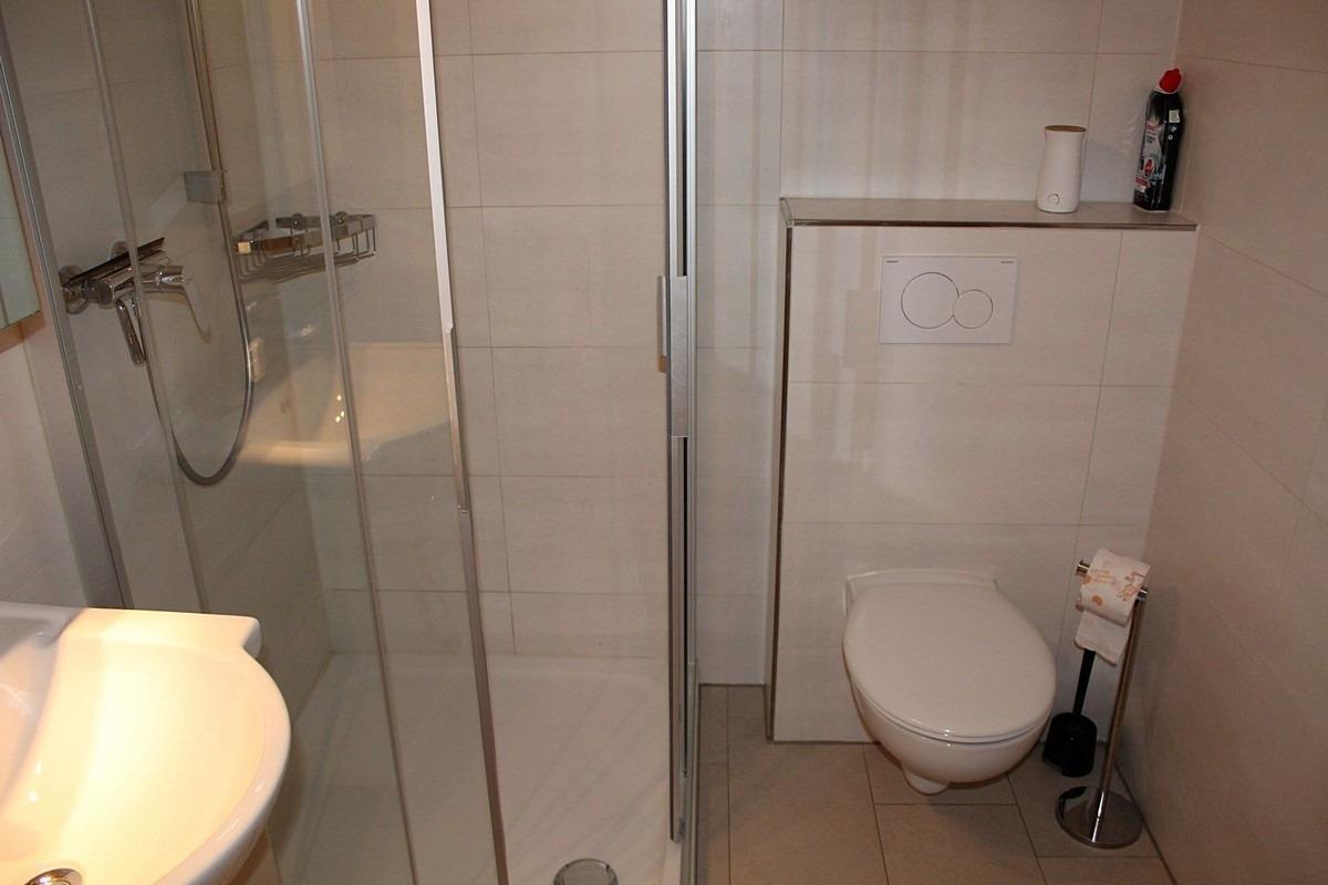 Badezimmer: Dusche, WC und Waschtisch