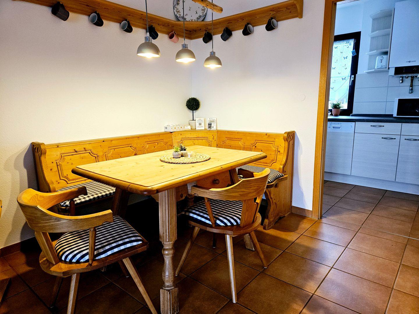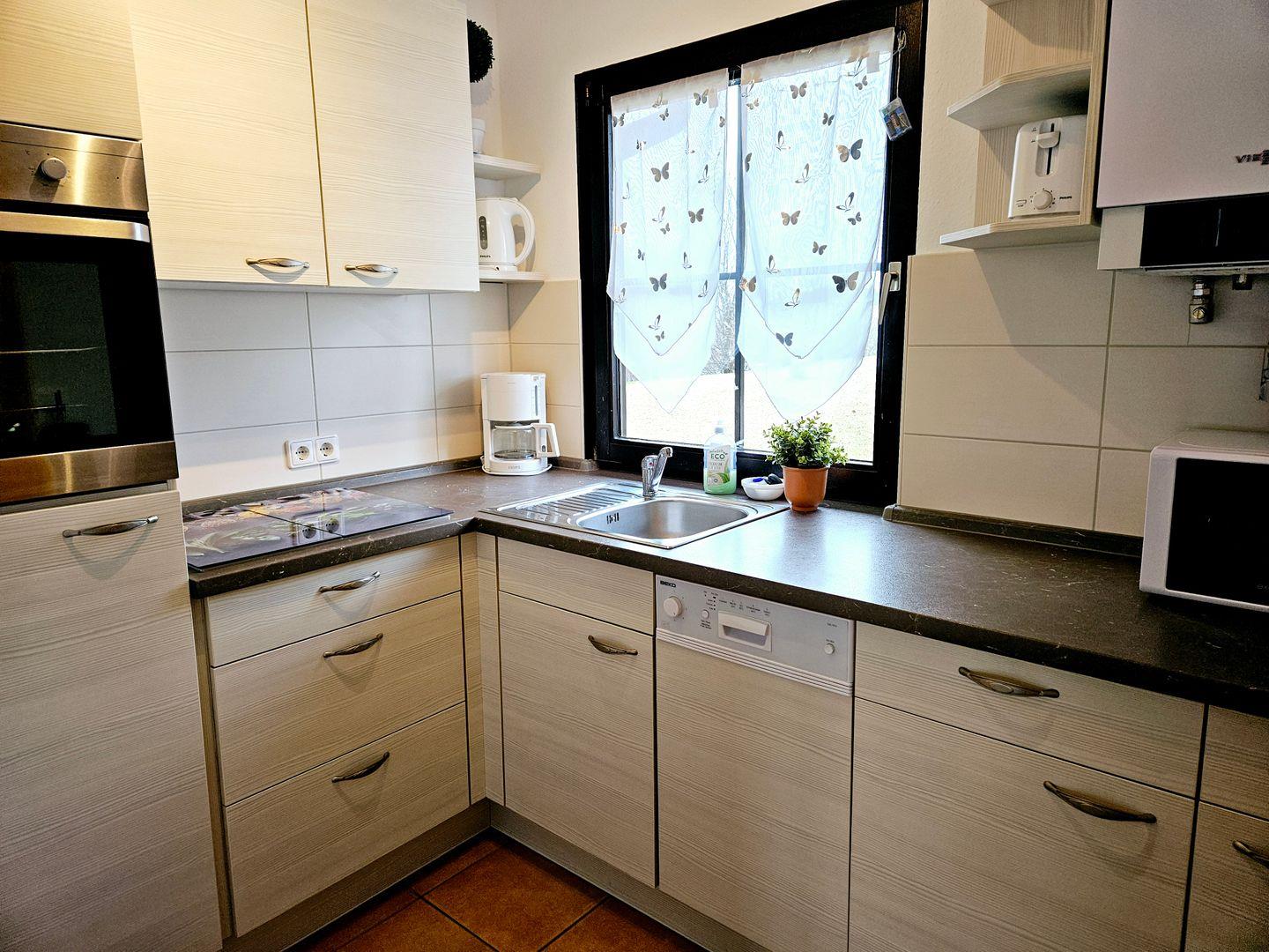 Die gut ausgestattete, geschlossene Küche bietet alles, was Sie für Ihre kulinarischen Kreationen benötigen: vom Herd mit Elektrobackofen über eine Spülmaschine bis hin zu Mikrowelle und Kühlschrank mit Gefrierfach. Ein Esstisch steht bereit, um gemeinsame Mahlzeiten in geselliger Runde zu genießen.