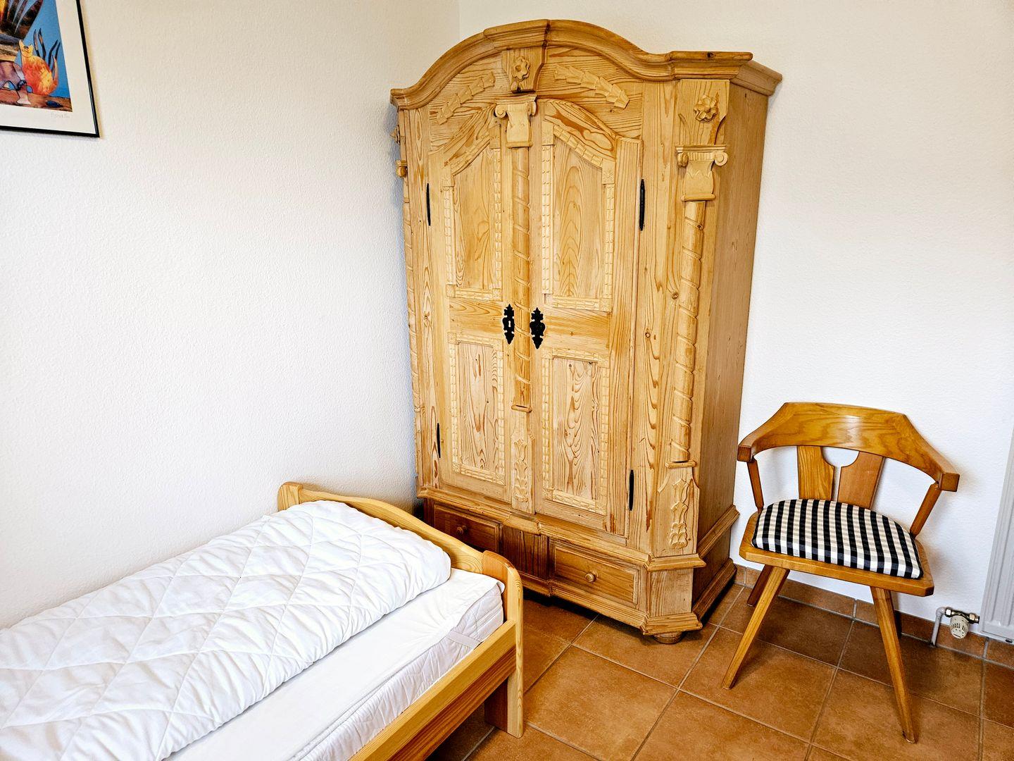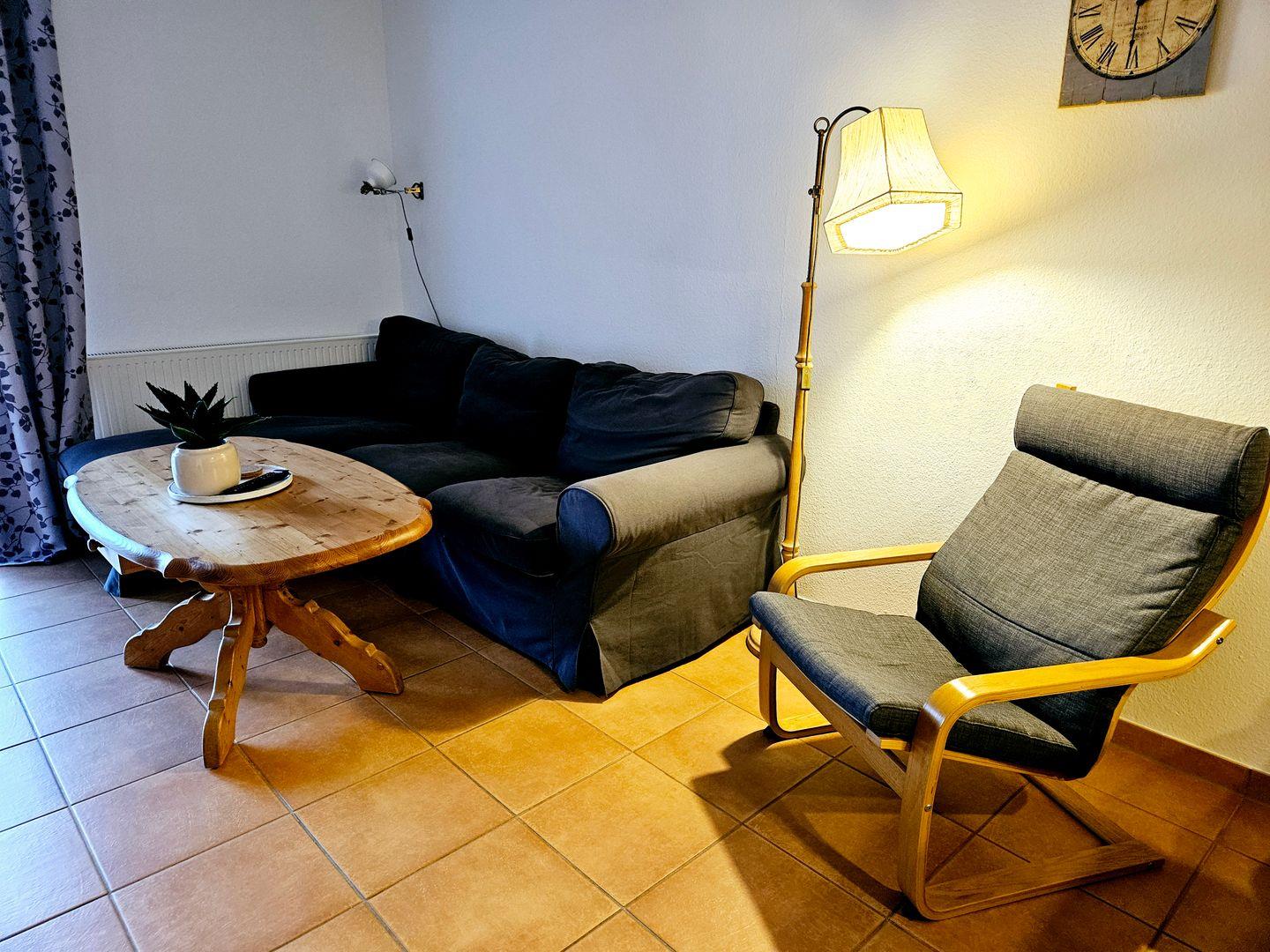 Die Ferienwohnung besticht durch ihre liebevolle Ausstattung. Sie verfügt über zwei freundlich gestaltete Schlafzimmer, die mit hochwertigen Fliesenböden ausgestattet sind, eines mit Doppelbett, eines mit zwei Einzelbetten. Das Wohnzimmer ist der perfekte Ort, um gemeinsame Stunden zu verbringen – hier lädt eine gemütliche Sofaecke zum Entspannen ein. Genießen Sie einen Filmabend am Fernseher mit Satellitenanschluss oder nutzen Sie das kostenlose WLAN, um Ihre Erlebnisse mit Freunden und Familie zu teilen.