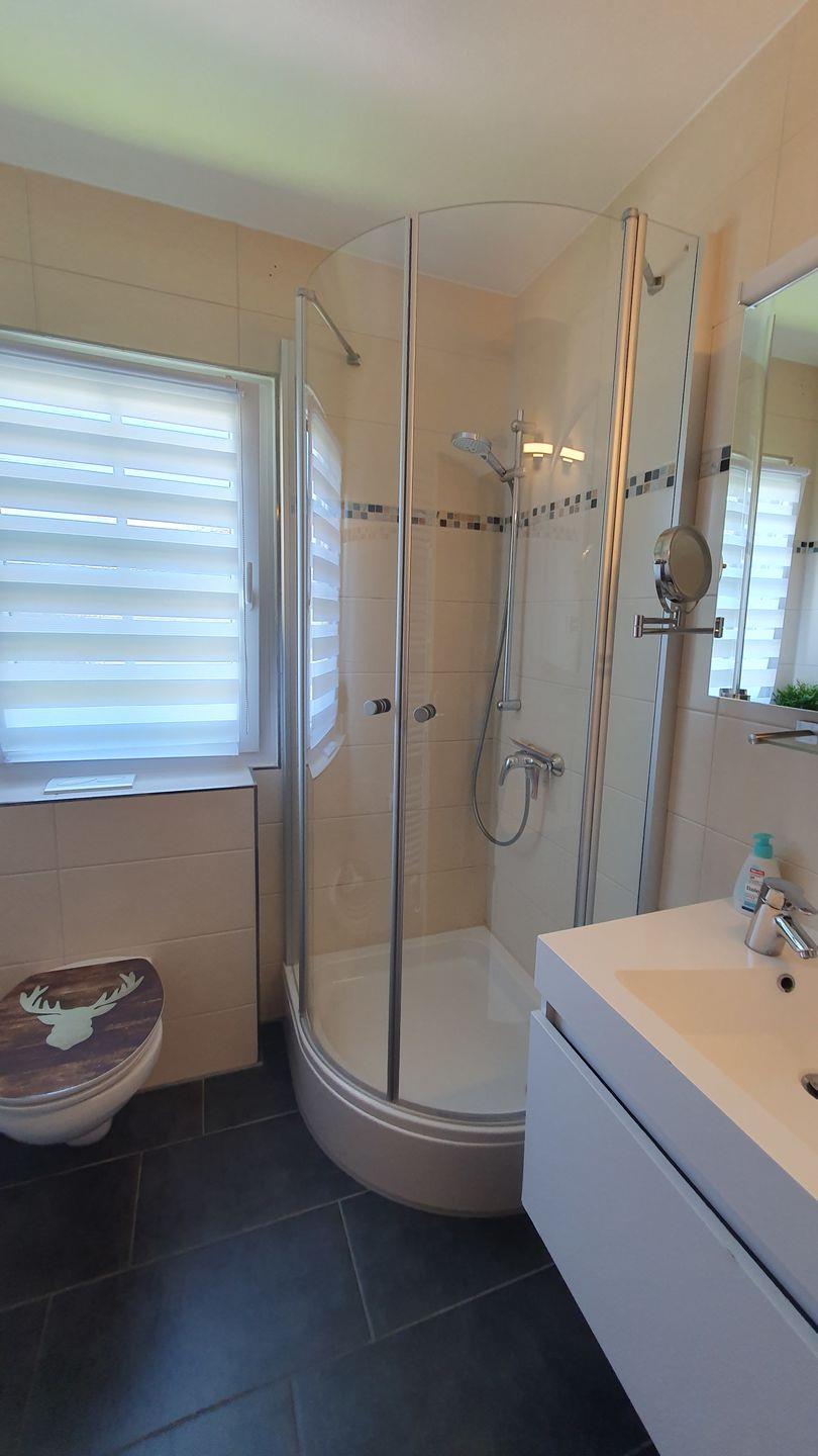 Im Badezimmer finden Sie eine praktische Dusche, sowie die notwendigen Einrichtungen, die Ihren Aufenthalt komfortabel gestalten. Für zusätzlichen Komfort stehen Ihnen Waschmaschine, Trockner und Wäscheständer, die gemeinschaftlich im Waschhaus genutzt werden, zur Verfügung.