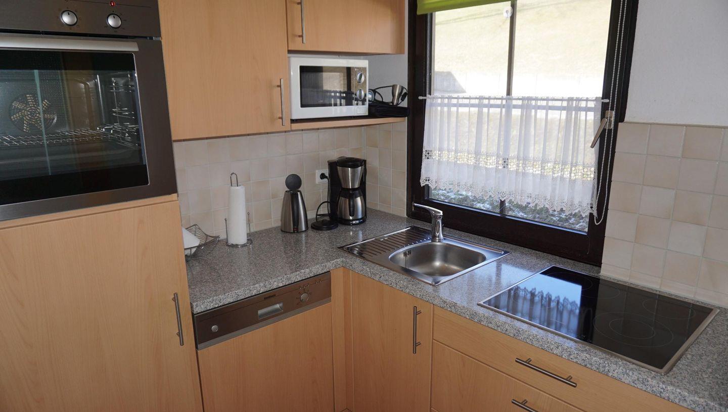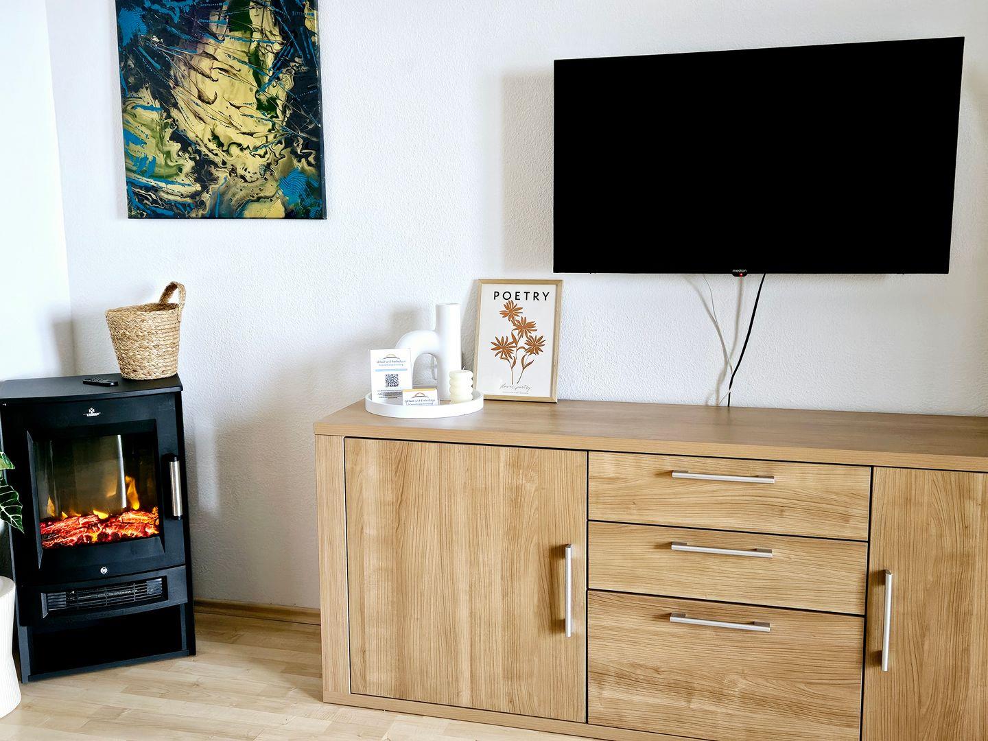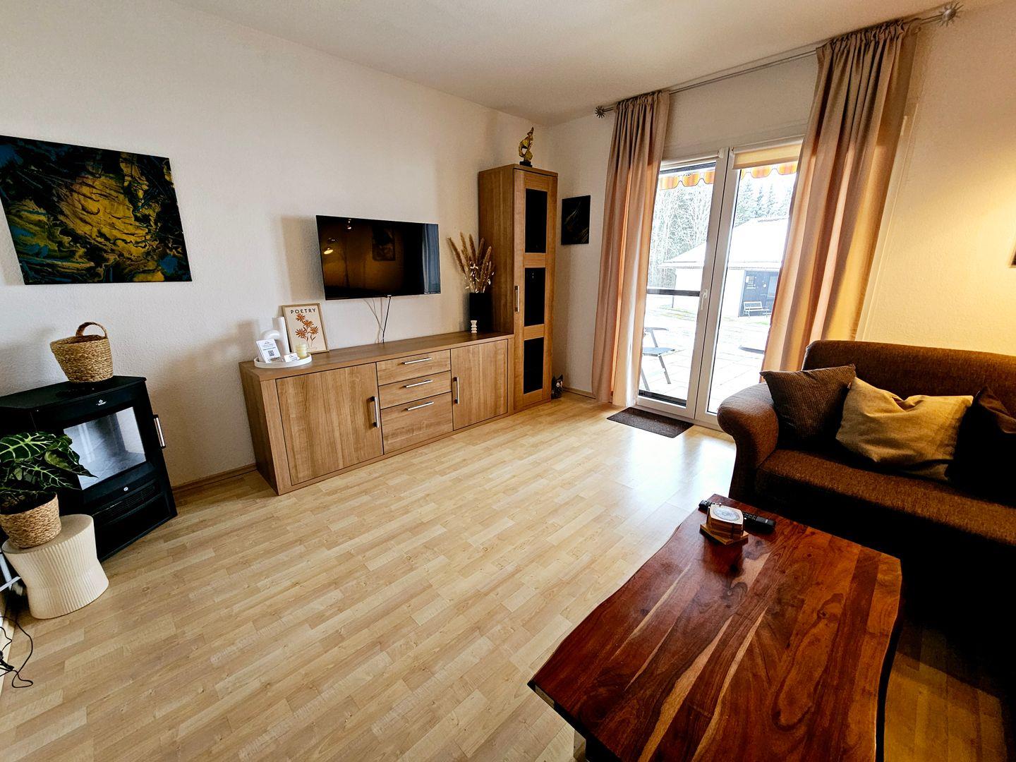 Die Unterkunft verfügt über zwei gemütliche Schlafzimmer, eines mit Doppelbett, eines mit zwei Einzelbetten, die mit Laminatböden ausgestattet sind und einen erholsamen Schlaf garantieren. Im hellen Wohnzimmer können Sie entspannen und die Zeit gemeinsam verbringen. Eine Sofaecke mit flackerndem Kaminfeuer lädt zu gemütlichen Abenden ein, während der Essbereich Platz für gemeinsame Mahlzeiten bietet. Die vollständig ausgestattete, geschlossene Küche mit modernen Geräten, einschließlich einem Kühlschrank, einem Ceranfeld und einer Mikrowelle, macht das Kochen zum Vergnügen.