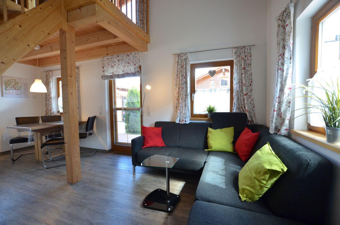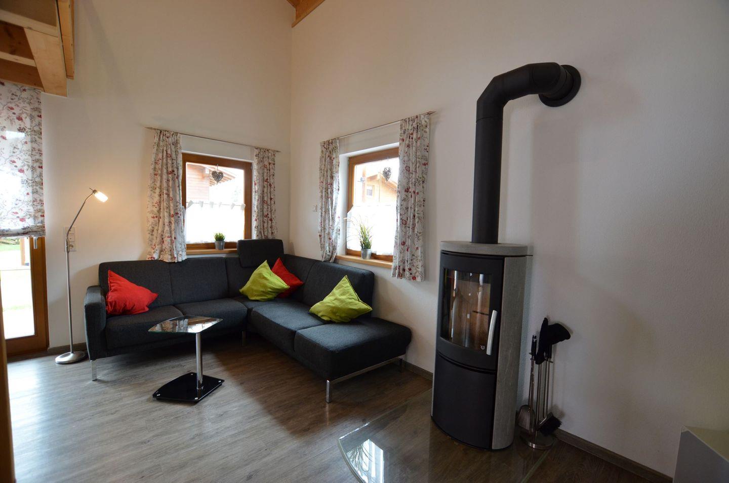 Verbringen Sie unterhaltsame Abende auf der bequemen Couch mit TV-Ecke und Wohlfühlatmosphäre durch den Kamin inklusive Feuerholz. Der offene Wohnbereich ist mit Fußbodenheizung ausgestattet.