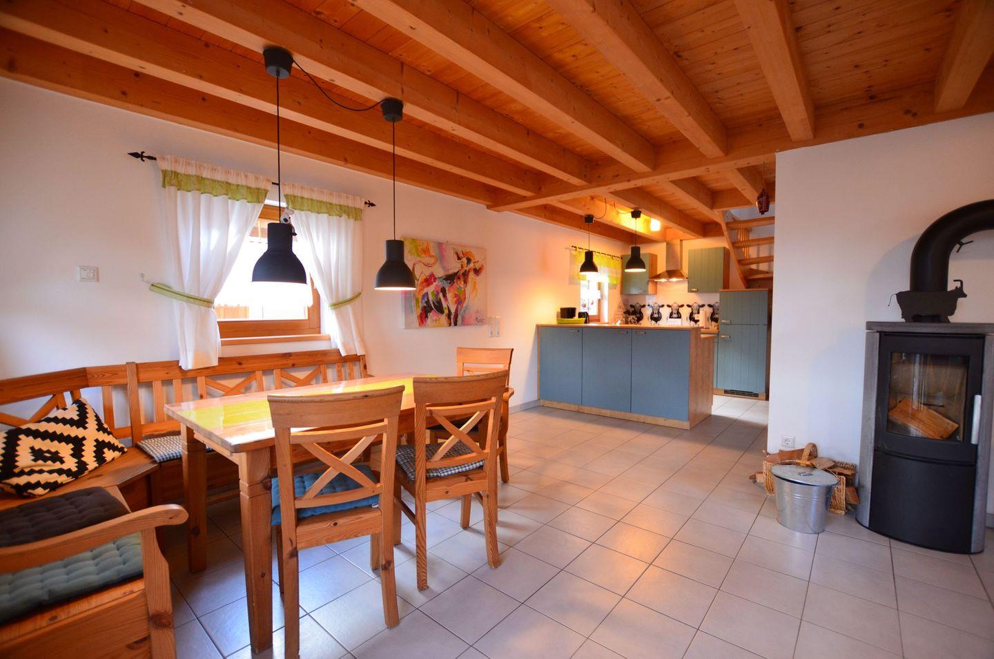 Viel Platz bietet die gut ausgestattete Landhausküche. Der große Wohnbereich ist gemütlich eingerichtet mit Schwedenofen.