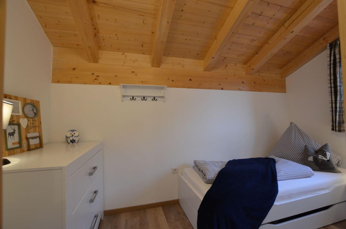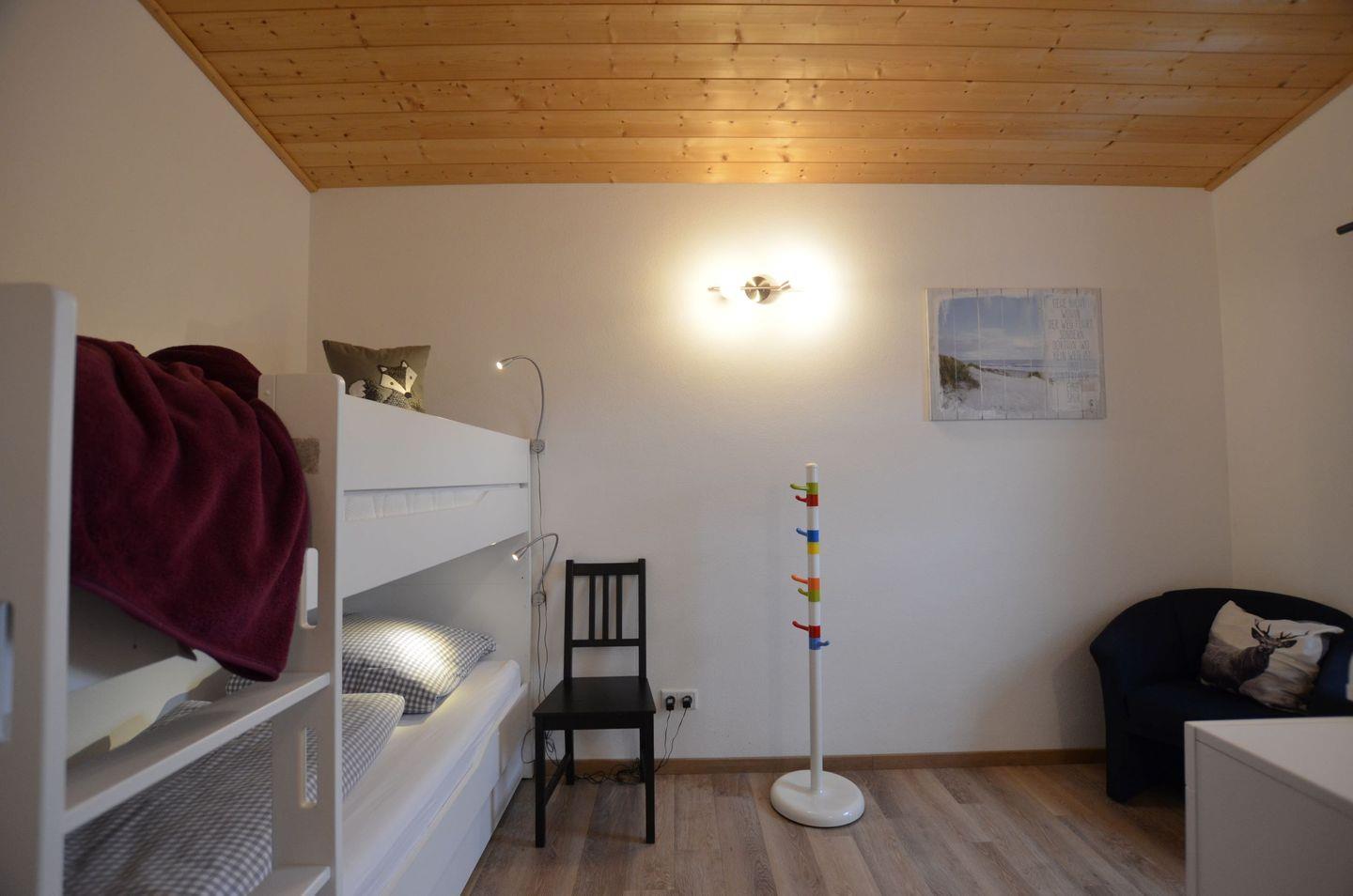 Das Schlafzimmer im Erdgeschoß ist mit Etagenbett, Wickelkommode und Sessel ausgestattet