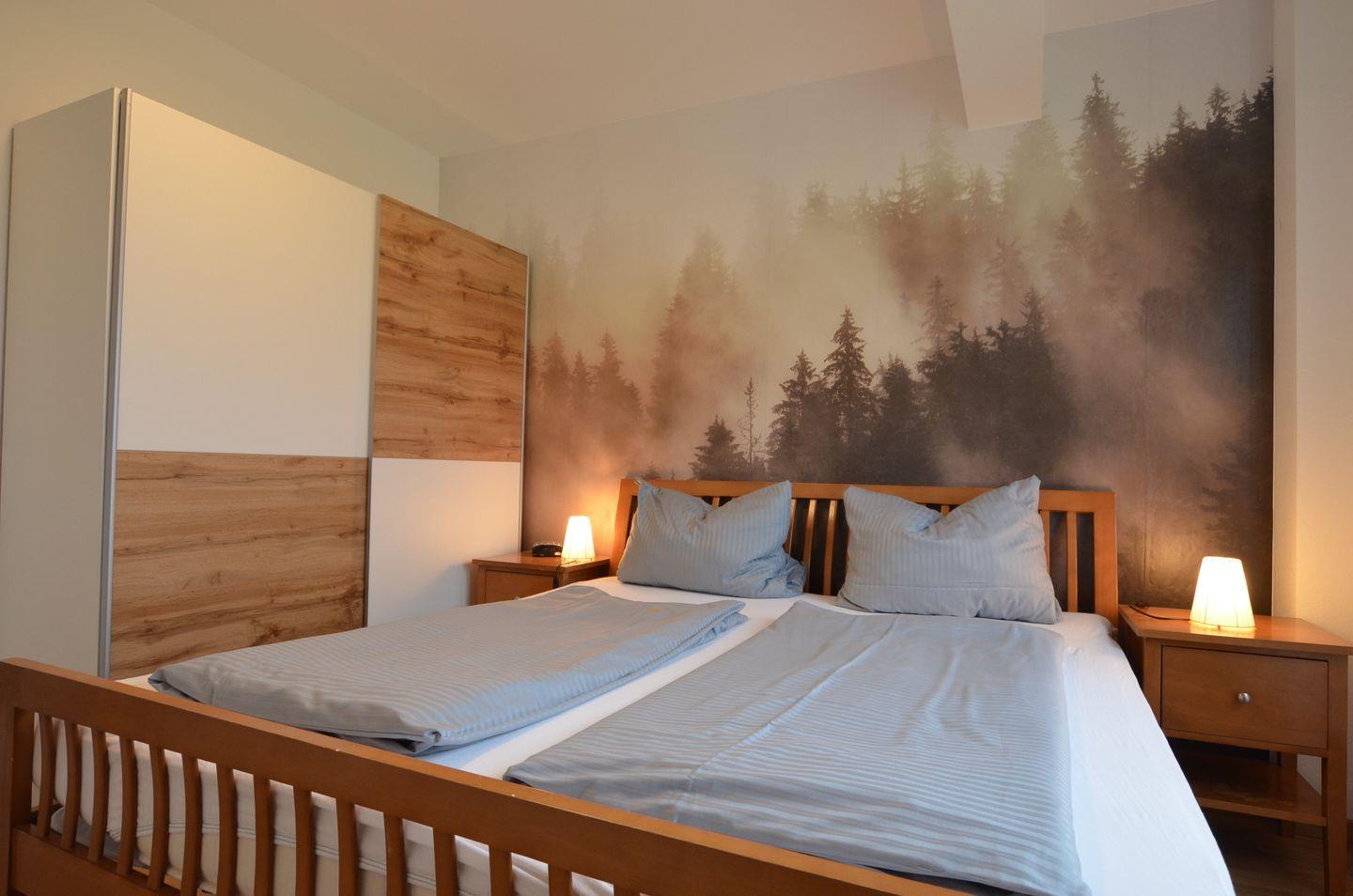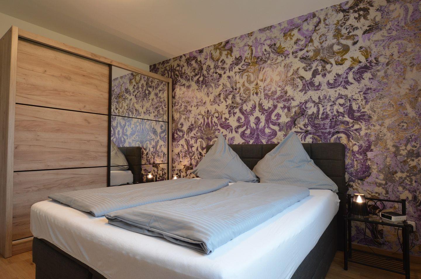Über die Treppe erreichen Sie die vier Schlafzimmer, jeweils mit Doppelbett, Kleiderschrank und Fernseher.