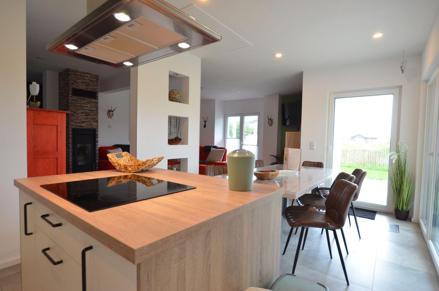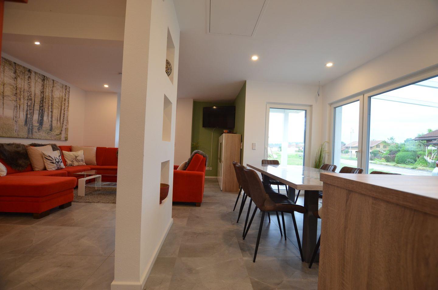 Lichtdurchflutete Räume, ein komfortabler offener Wohnbereich mit Kamin, großem Essbereich und komplett ausgestatteter Küchenzeile laden Sie ein einen erholsamen Urlaub im Allgäu im Flößerdorf Lechbruck am See zu verbringen.