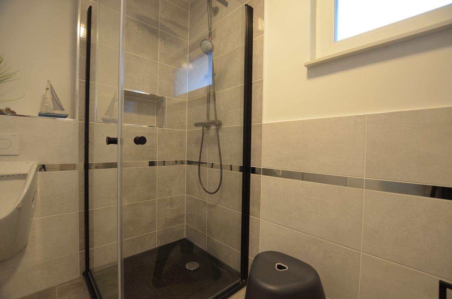 Im Erdgeschoß erwartet Sie ein kleines Bad mit WC und Dusche. Ein kleiner Abstellraum unter der Treppe verfügt über einen zusätzlichen Kühlschrank mit Gefrierfach.