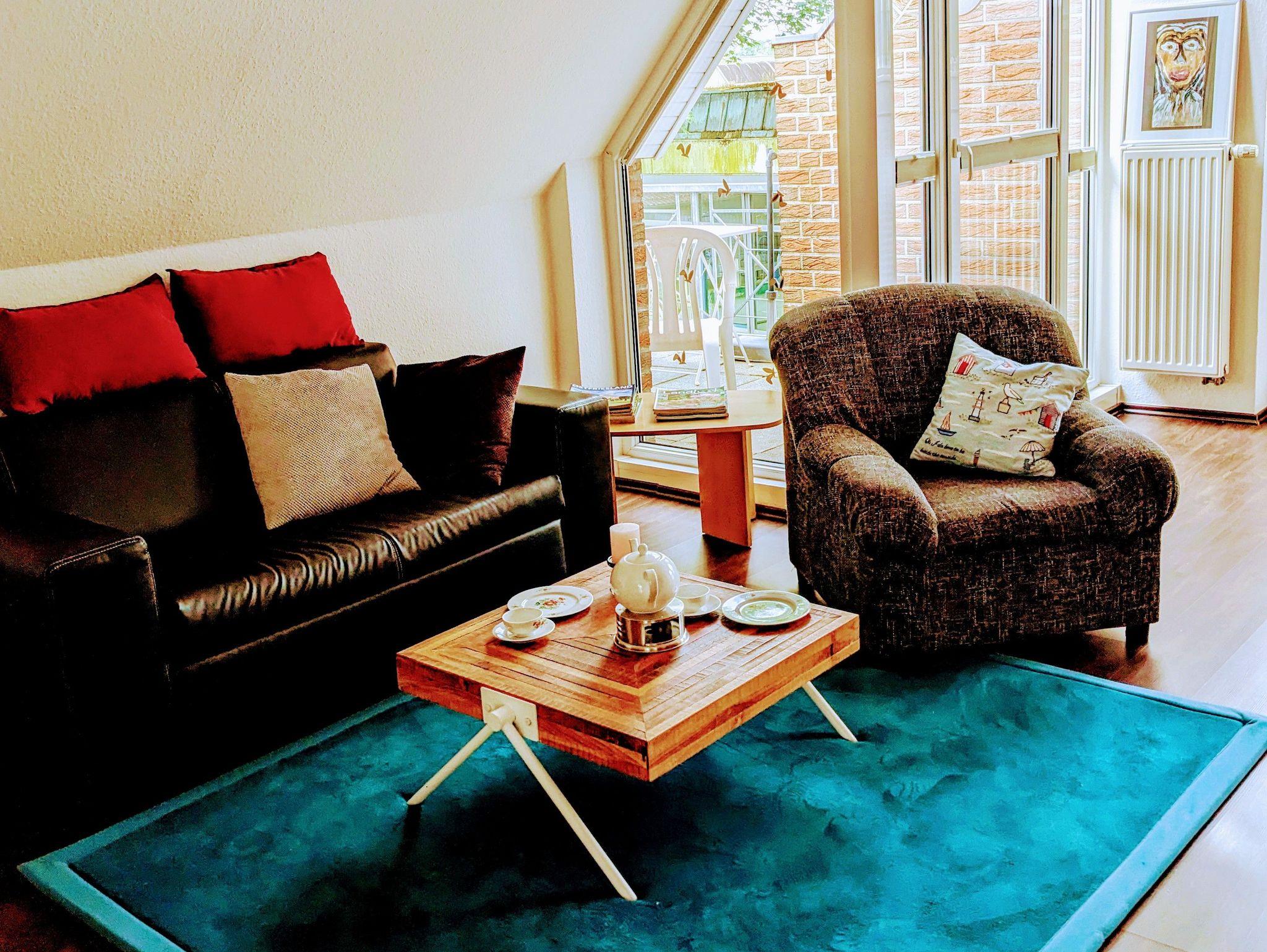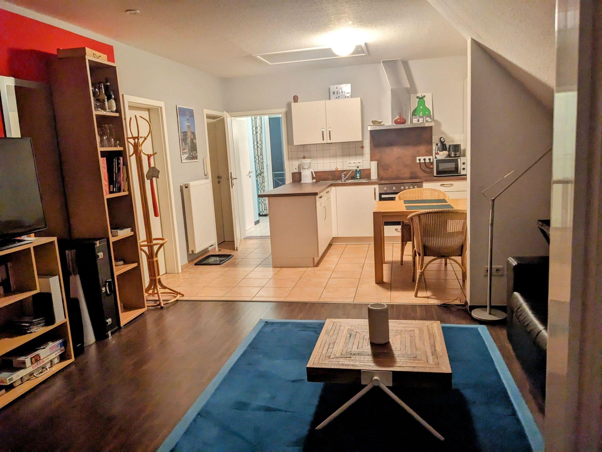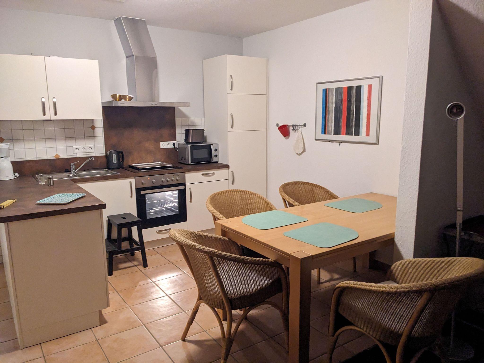 Das 50 Quadratmeter große Appartement ist über eine Treppe im ersten Stock zu erreichen. Die Ferienwohnung ist seniorenfreundlich eingerichtet. Zum Haus gehören ein abschließbarer Fahrradschuppen und ein PKW-Stellplatz. Die Küche ist umfänglich ausgestattet mit Geschirrspülmaschine, Mikrowelle und Kaffeemaschine. Im Duschbad stehen zusätzlich eine Waschmaschine und ein Trockner. Im nicht einsehbaren Schlafbereich befinden sich zwei 1.20 m breite, hintereinanderstehende Betten mit hohem Einstieg. Ein großer Tisch, vier gemütliche Loomstühle, die auch auf dem Balkon benutzt werden können, bilden den Essbereich. Ein bequemes Sofa, leicht zur Schlafliege umbaubar, mit einem dazugehörenden Sessel und ein großer Fernseher runden die Wohnung ab. Zur weiteren Ausstattung gehören eine Klimaanlage, ein Insektenschutz zum Balkon hin und eine zusätzliche Fußbodenerwärmung in Küche und Bad. Der Internetzugang über Wlan ist kostenfrei.