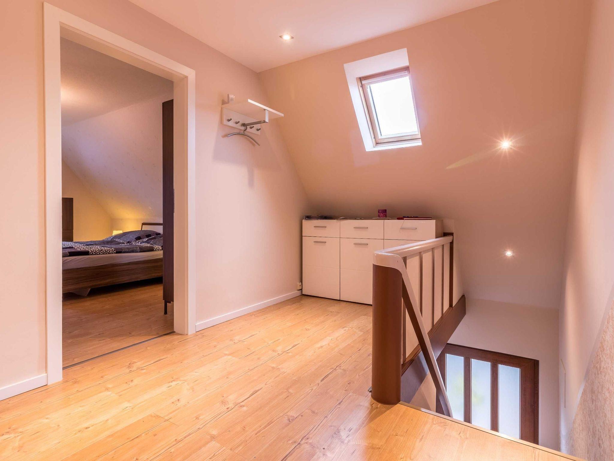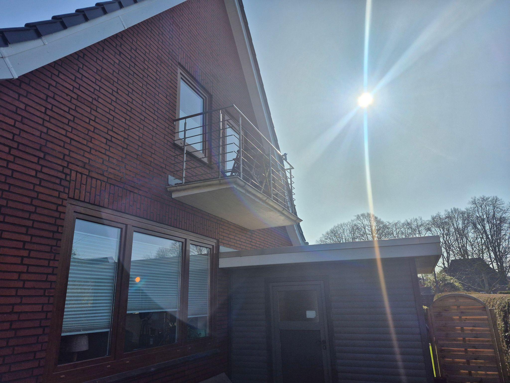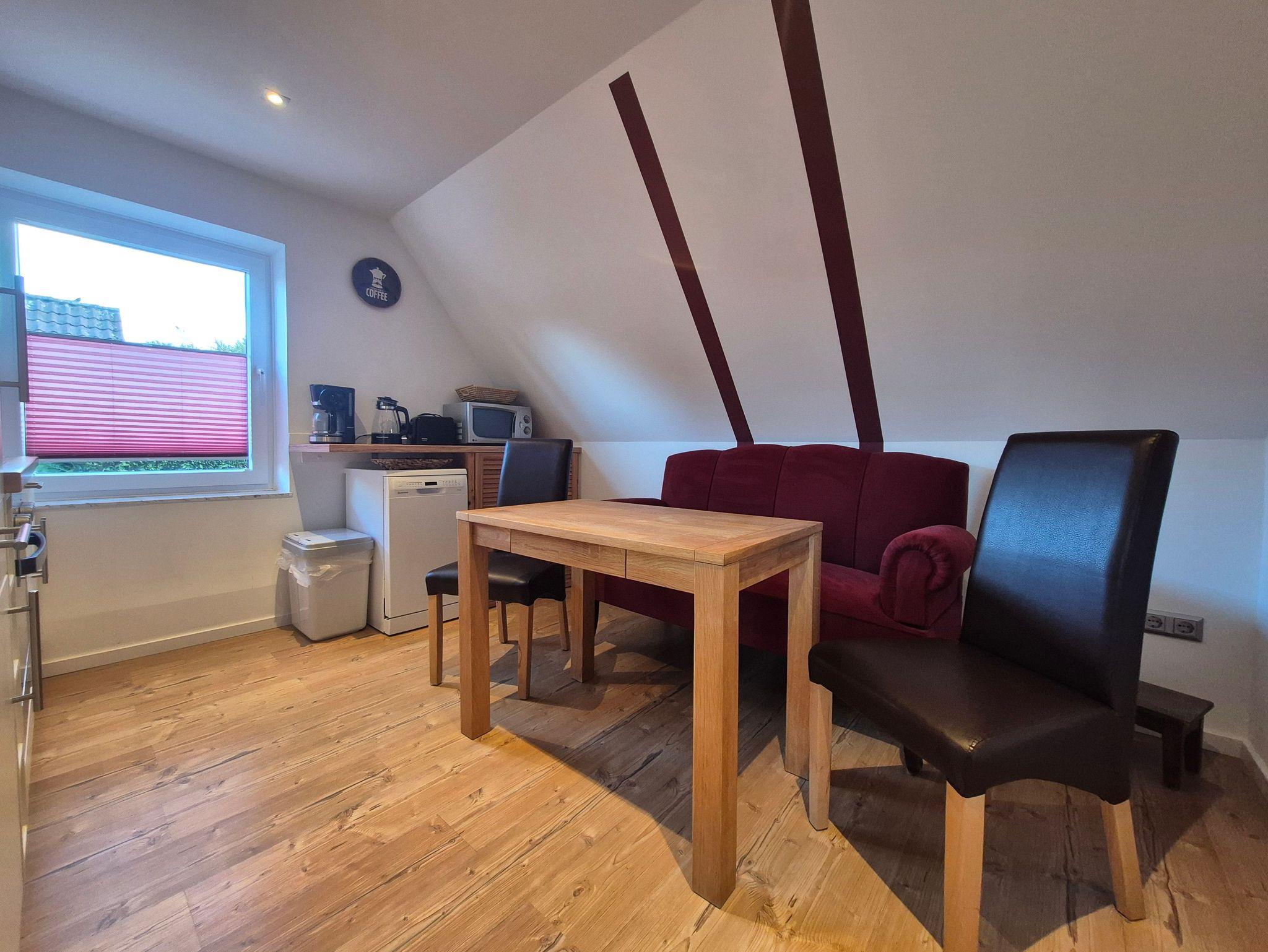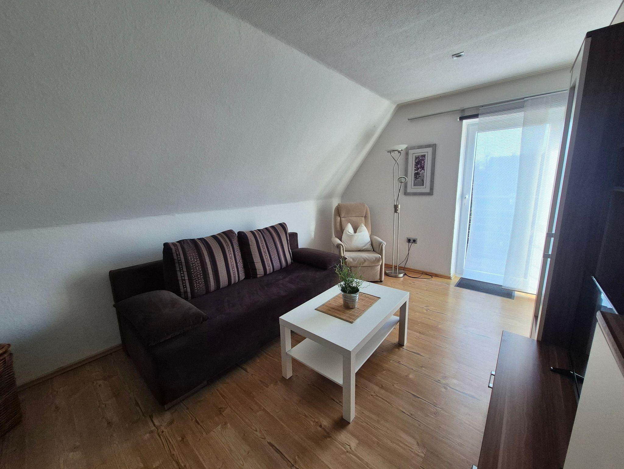 Sonnige Ferienwohnung im Obergeschoss eines Einfamilienhauses. Separater Eingang, Küche mit Essecke, Schlafzimmer mit Doppelbett, Wohnzimmer, Badezimmer mit Dusche und WC.