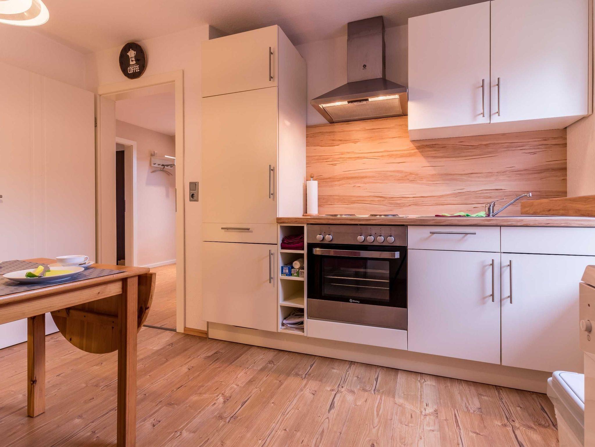 Zu den Räumlichkeiten gehört eine Küche mit Essecke, Schlafzimmer (an den Betten sind Kopf- und Fußteil höhenverstellbar) und Wohnzimmer je mit Kabel TV, Badezimmer und Balkon. Diese Ferienwohnung ist allergikerfreundlich.