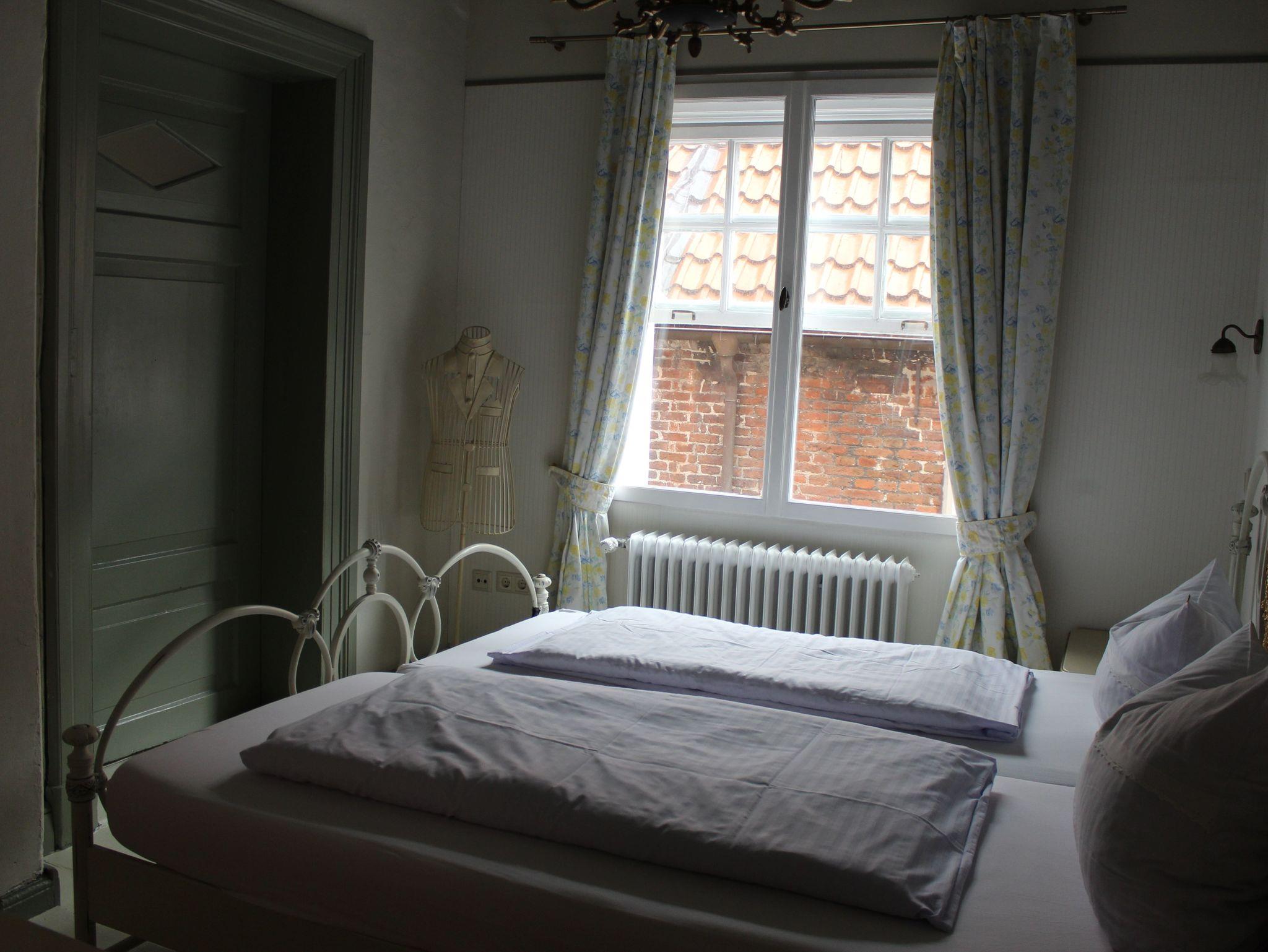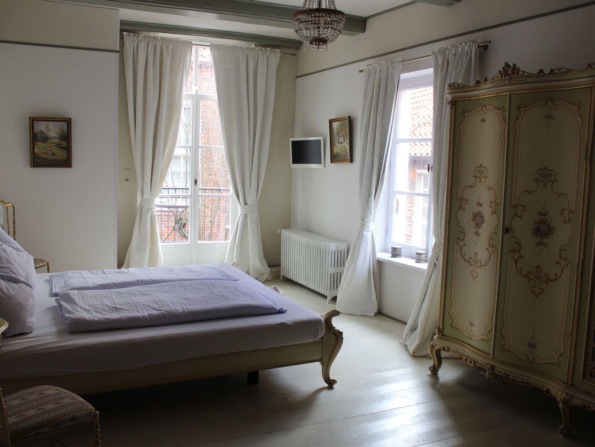 Diese fünf Sterne Wohnung von ca. 120 m² Größe ist mit zwei Schlafzimmern und einem großen Wohnzimmer mit ausgesuchten Antiquitäten ausgestattet. Ein gemütlicher Kaminofen lädt im Winter zum Verweilen ein. Das große Luxus-Badezimmer mit beleuchtetem Whirlpool für zwei Personnen bietet jede Menge Wellness. Zwei Waschbecken und eine Dusche sind ebenfalls vorhanden. Zudem verfügt die Wohnung über einen einem kleinen Balkon mit einen schönen Blick auf die Leeraner Altstadt.