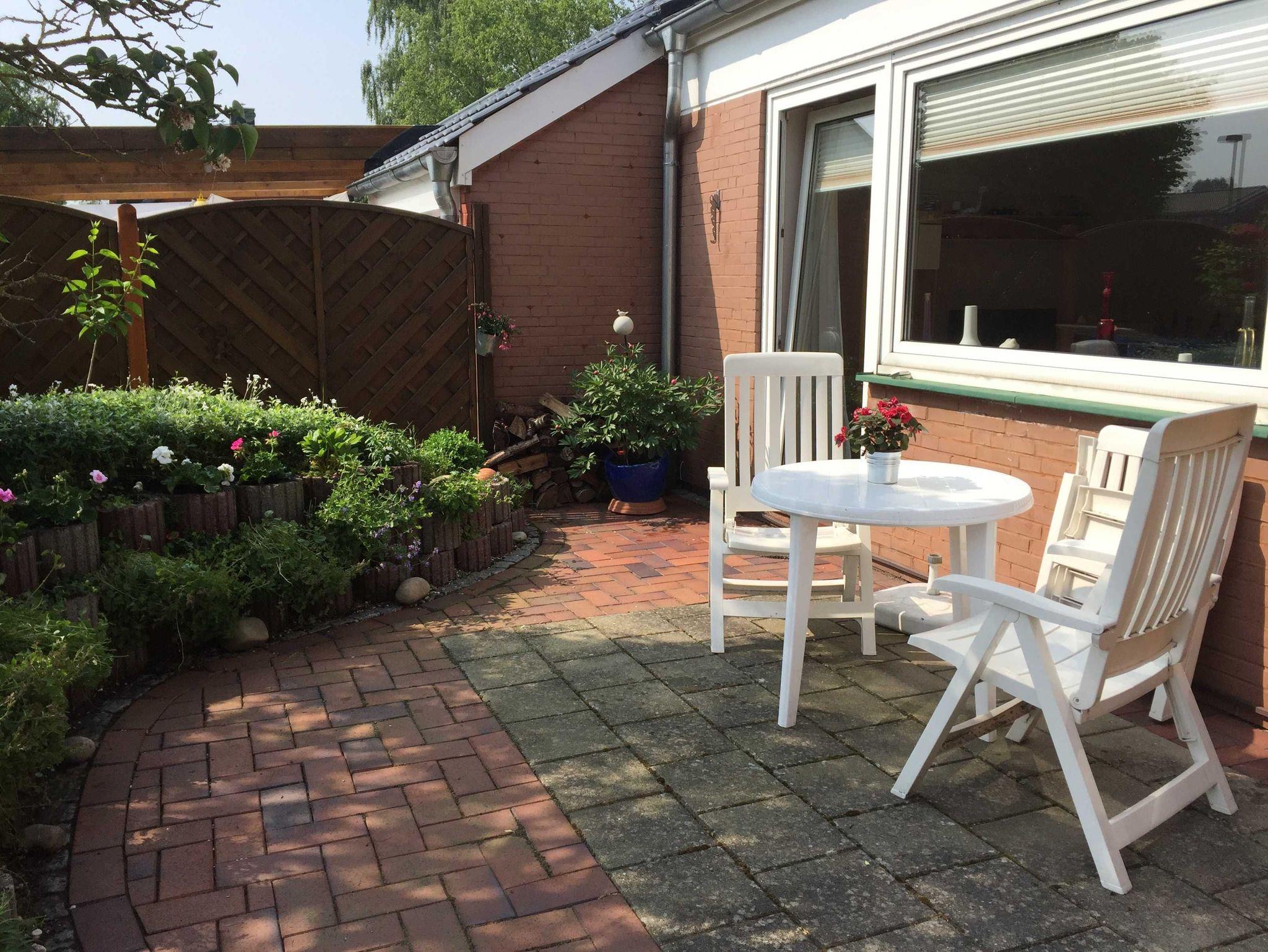 Eine sonnige Terrasse mit Garten, Gartenmöbeln, Grill lädt zum Verweilen ein. Ebenso gibt es eine Fahrradunterstellmöglichkeit.