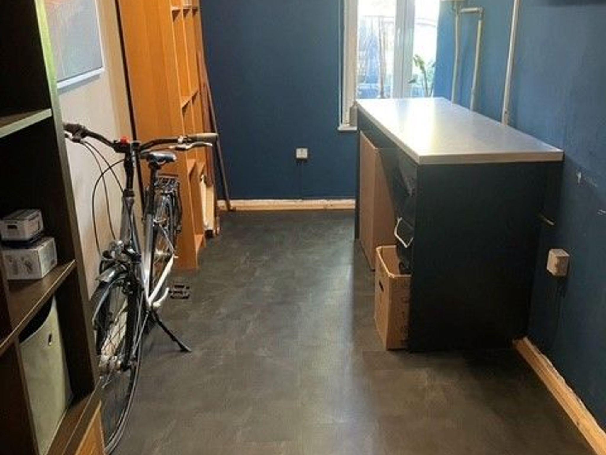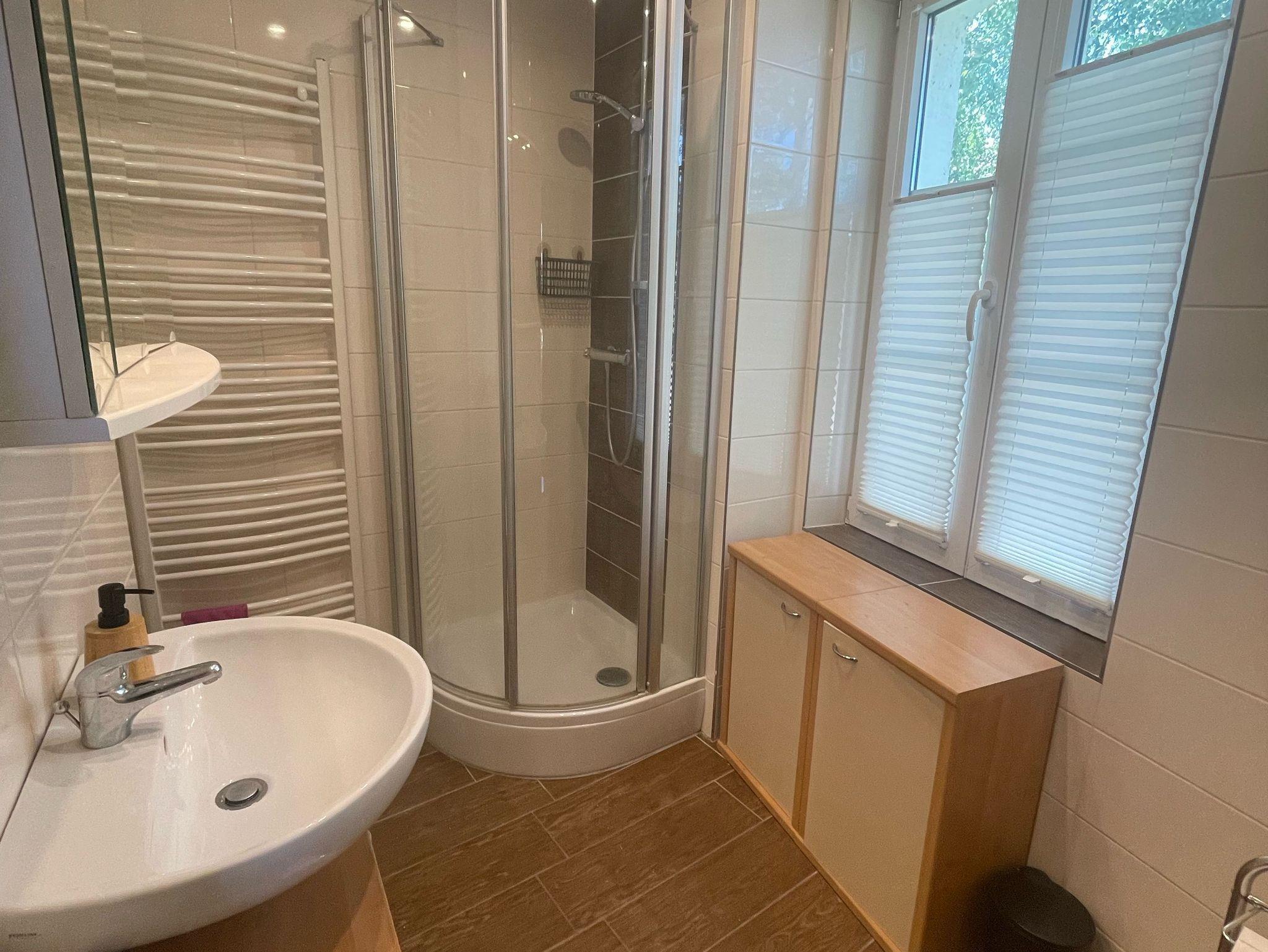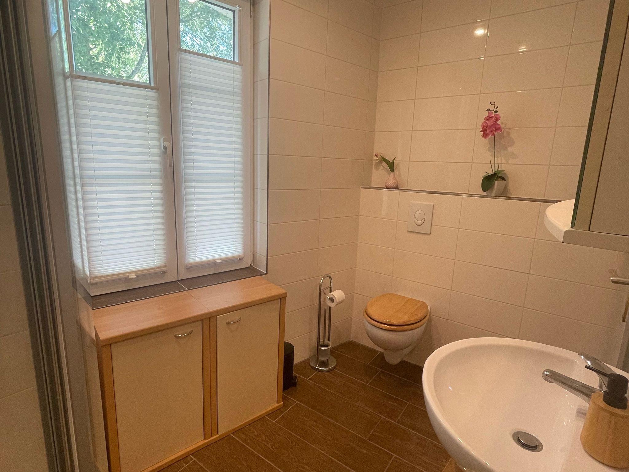 Das Tageslichtbad ist modern gestaltet und bietet neben Dusche, WC und Waschbecken auch praktischen Stauraum. Ein zusätzlicher Raum dient als Abstellmöglichkeit oder Fahrradraum und rundet das Platzangebot ab.