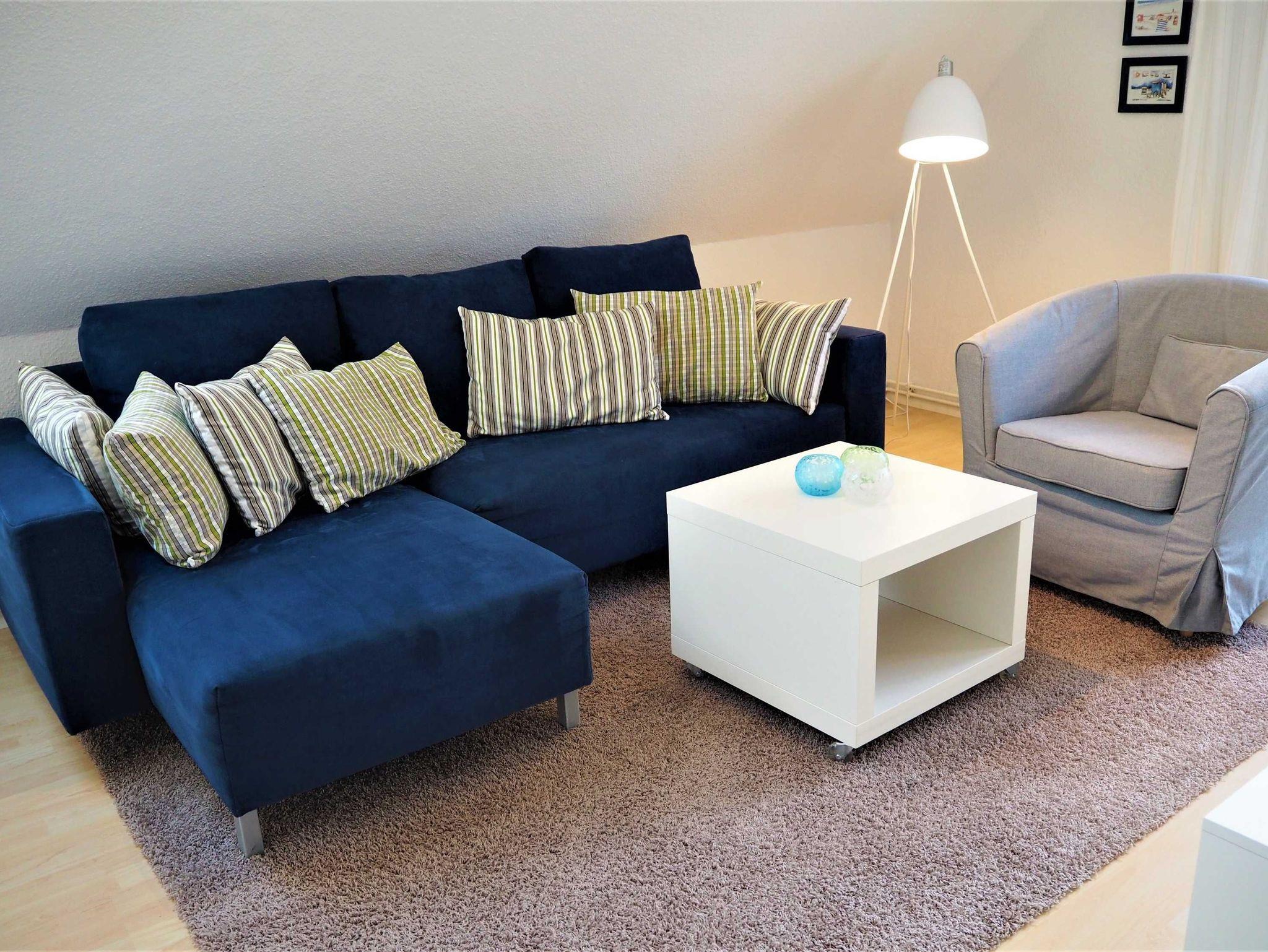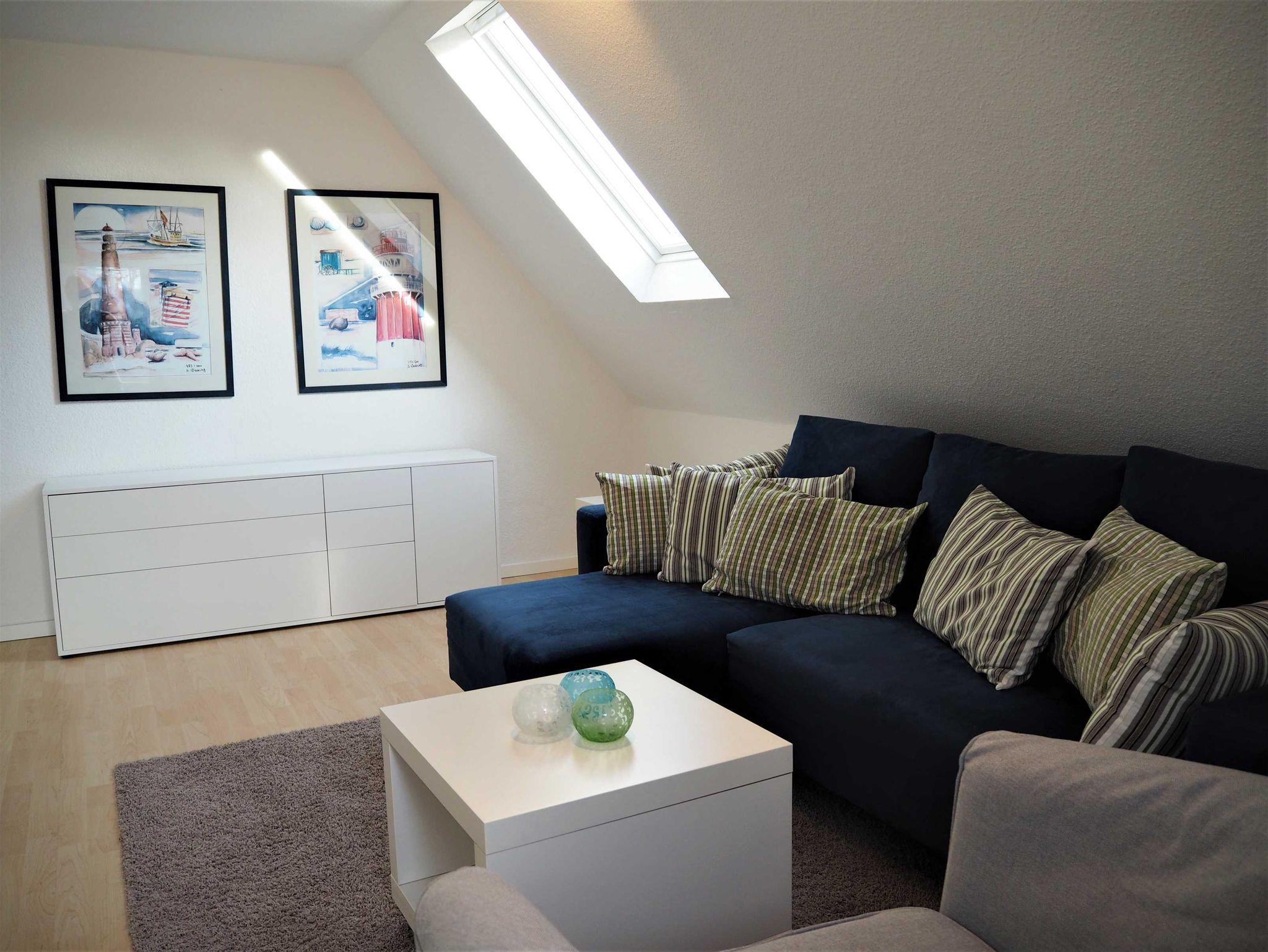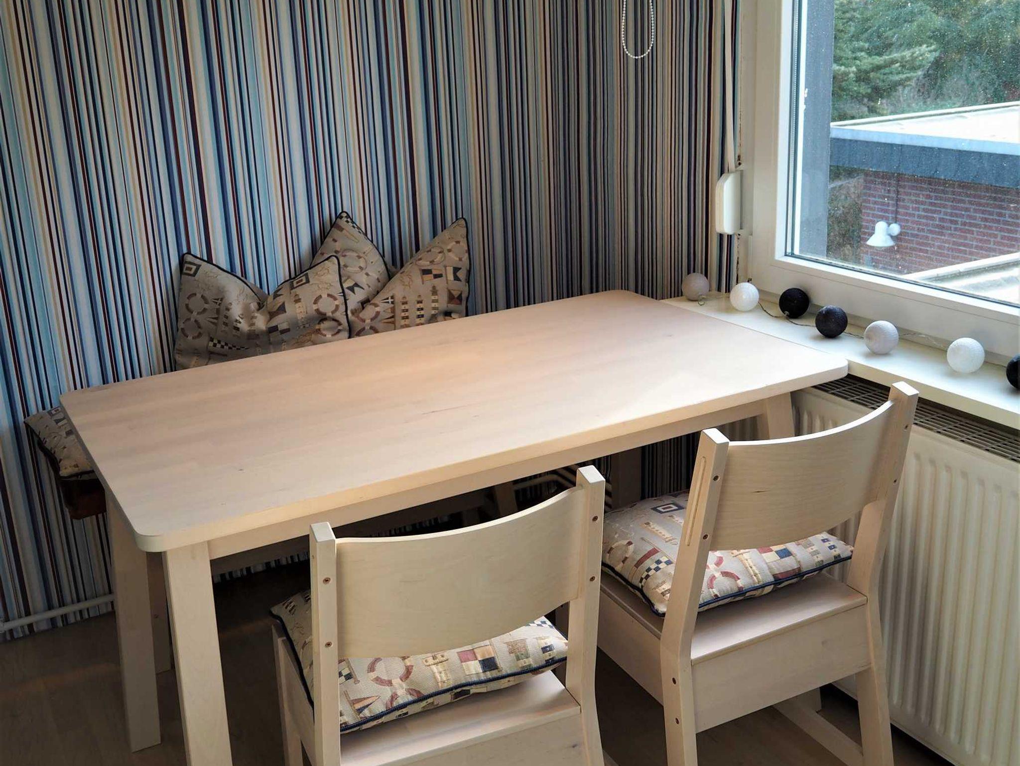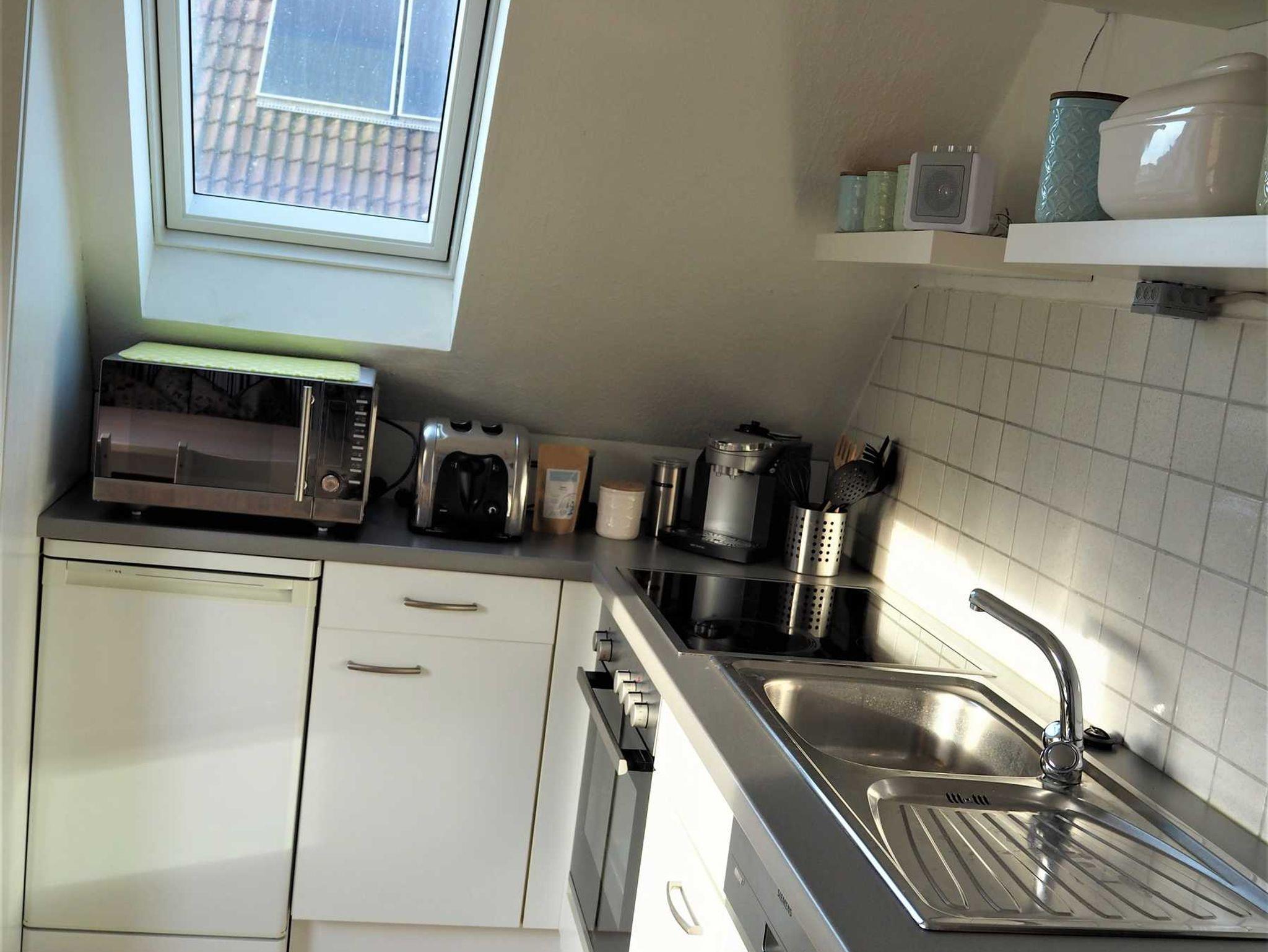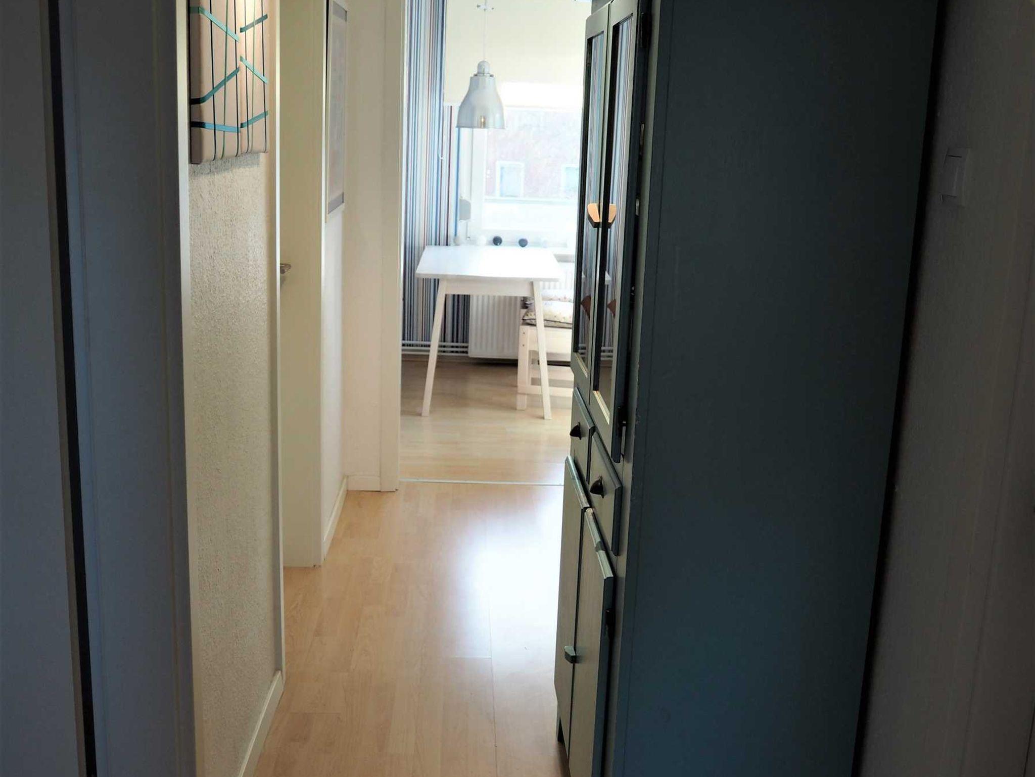 Ein Wohnzimmer, eine Küche sowie ein Duschbad mit Tageslicht. Die Schlafräume verfügen über Außenjalousien. Im Wohnzimmer gibt es einen Fernseher mit Kabel-Anschluss und DVD Player mit einer Auswahl an BlueRay Filmen, sowie eine Radio-CD-Kombination. Die Küche ist ausgestattet mit Herd, Spülmaschine, Backofen, Mikrowelle, Kaffeemaschine, Wasserkocher, Toaster und hält einen gemütlichen Essplatz bereit. Falls Wäsche anfallen sollte und gewaschen werden muss, kann nach Absprache eine Waschmaschine gegen Gebühren mit verwendet werden. Die Wohnung befindet sich im ersten Obergeschoss des Hauses.