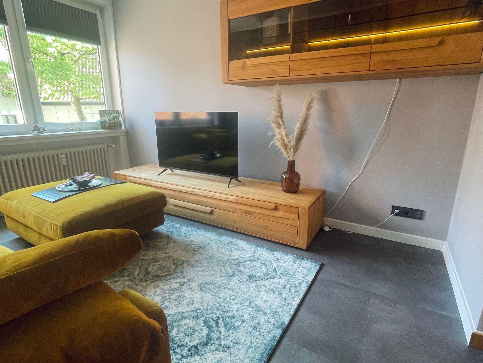 Das halboffene Wohnzimmer besticht mit einem bequemen, senfgelben Samtsofa, von wo aus der große Smart-TV hervorragend im Liegen und im Sitzen betrachtet werden kann.