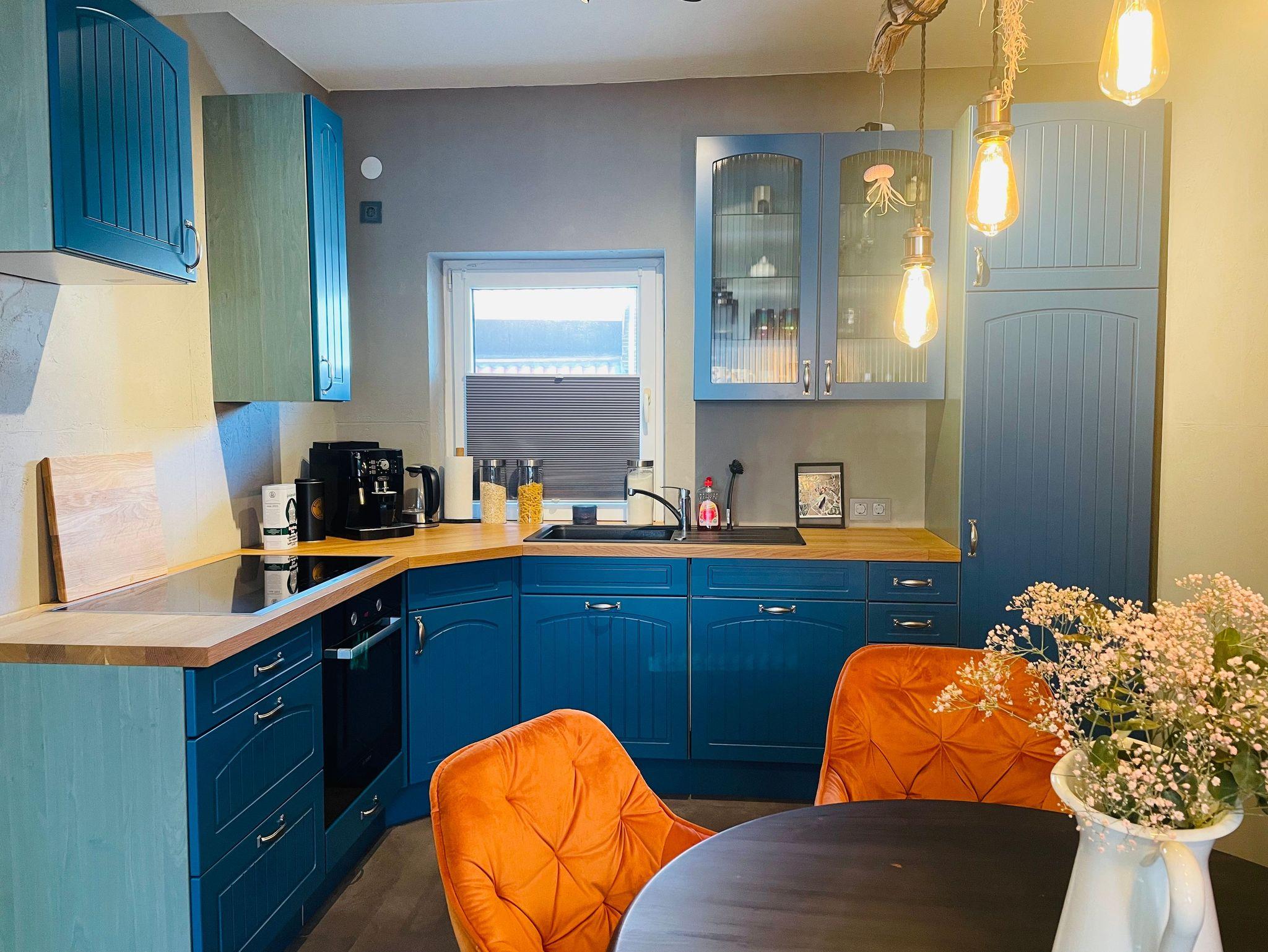 Das 90cm Induktionskochfeld, der Umluftbackofen, eine Spülmaschine, ein Kaffeevollautomat, eine Heißluftfriteuse und ein Gefrierfach lassen auch Hobbyköch*innen hier ein zweites zu Hause finden.