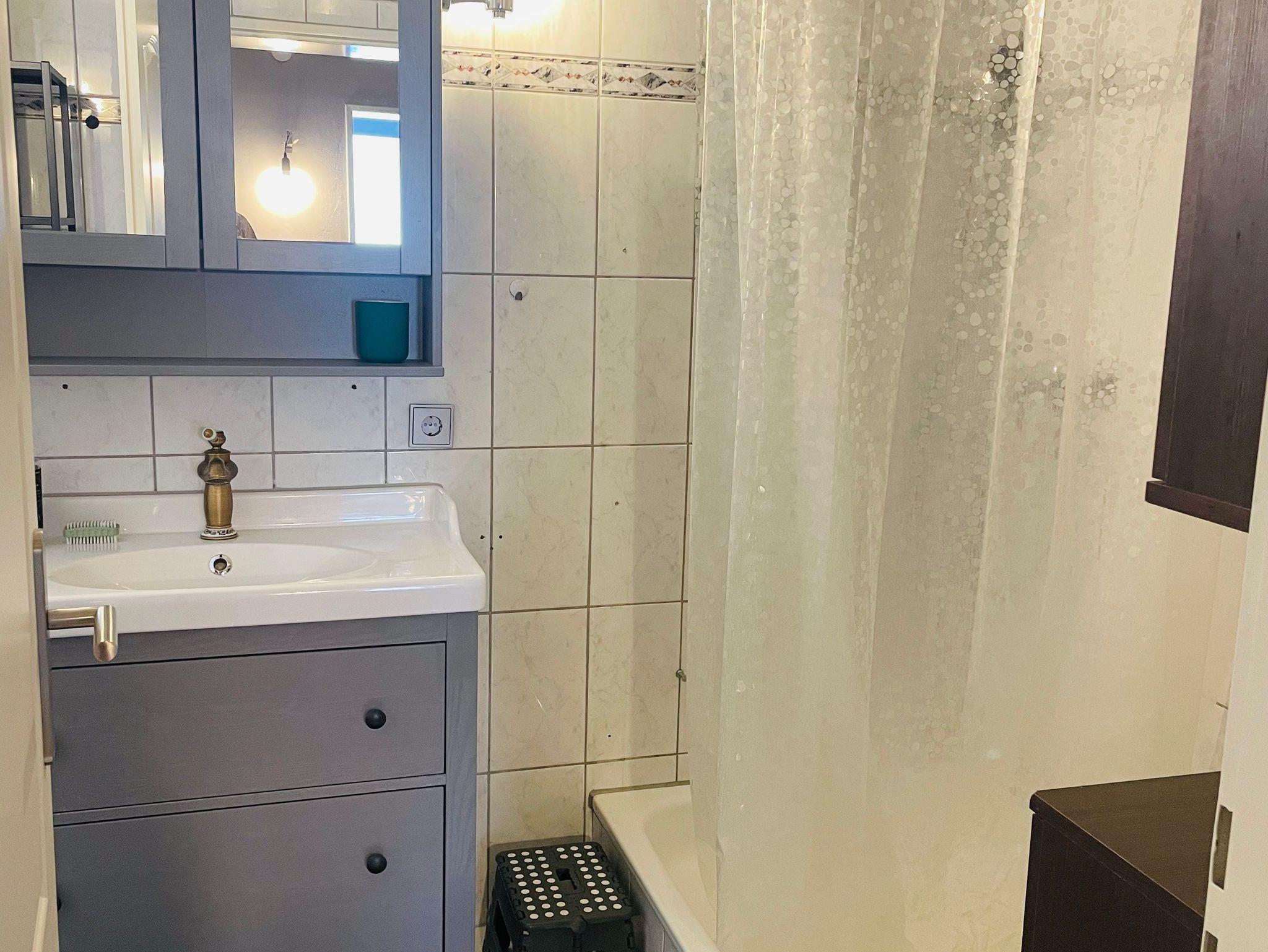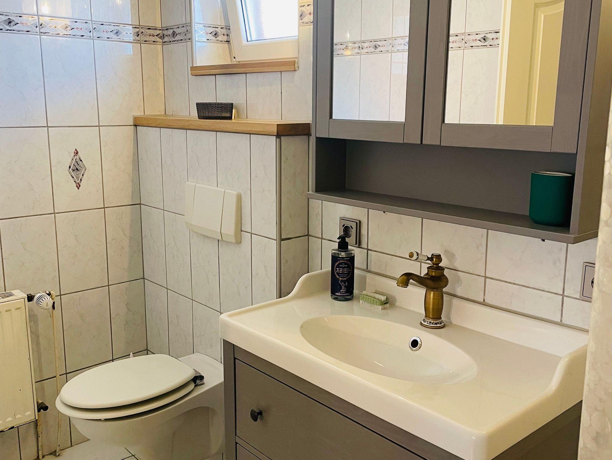 Das Tageslichtbad mit Dusche ist funktional und stilvoll eingerichtet und bietet ebenfalls genug Stauraum.