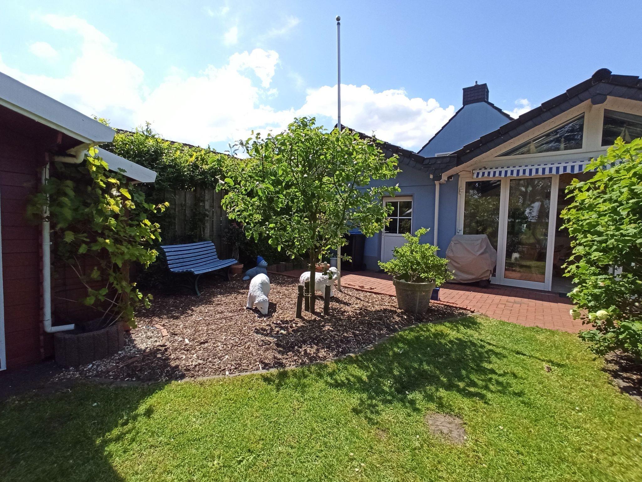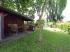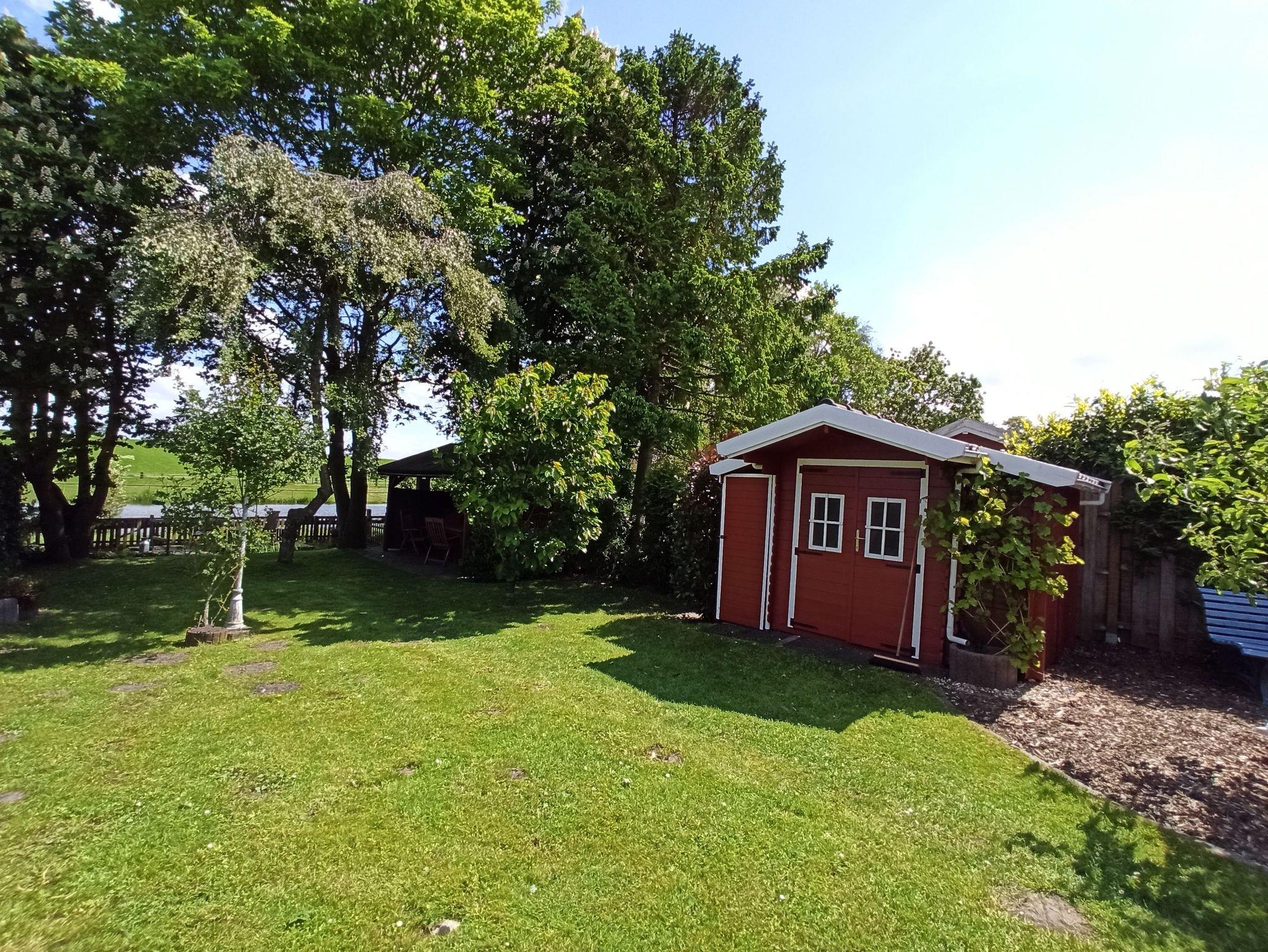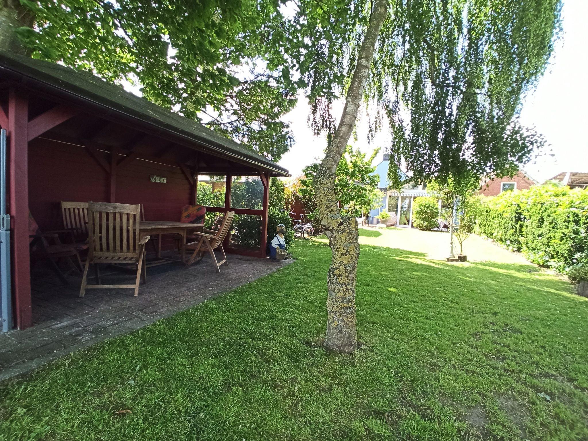 Im Garten ist eine Sitzgruppe mit einem Pavillion überdacht, von dem aus man die Enten auf dem kleinen Weiher und die Pferde auf der Weide des angrenzenden Pferdehofes beobachten kann.