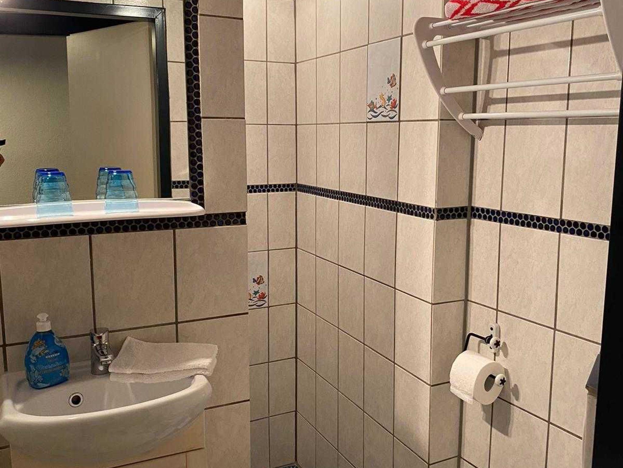 Das Bad hat eine begehbare Dusche, WC, Waschbecken und einen Duschhocker.
