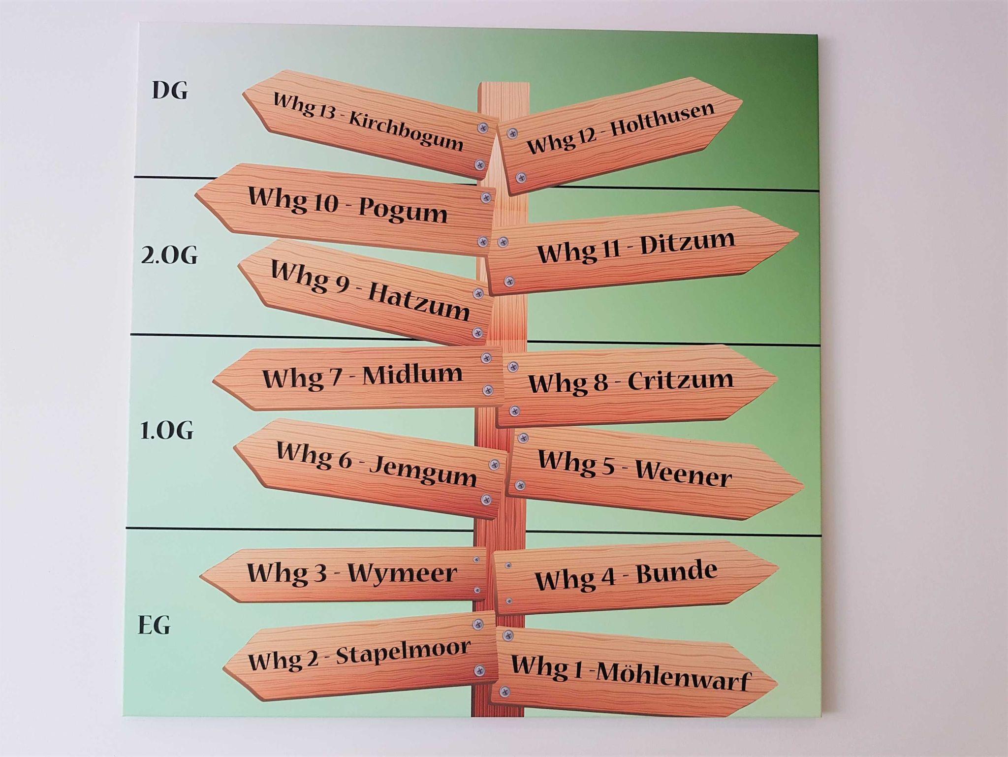 Die Ferienwohnung 10 Pogum befindet sich im 2. Obergeschoss eines zuvor als Schule genutzten Gebäudes mit 13 Wohnungen über 3 Etagen, ca. 2 Minuten entfernt von der Fußgängerzone in Leer.