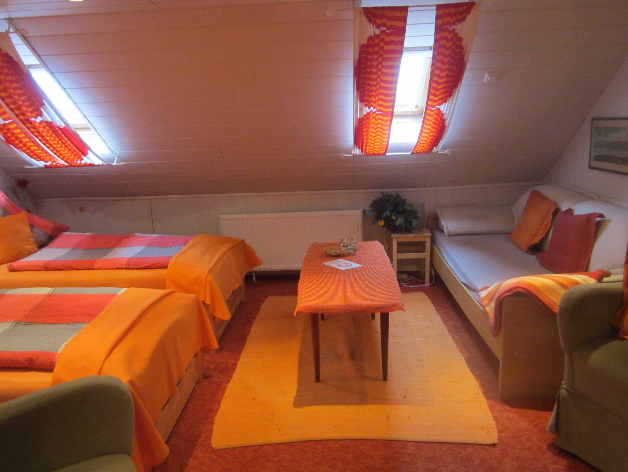 Dachgeschoss: großes Wohn-/Schlafzimmer mit drei Einzelbetten (90 cm x 200 cm), Sitzecke, Zustellbett.