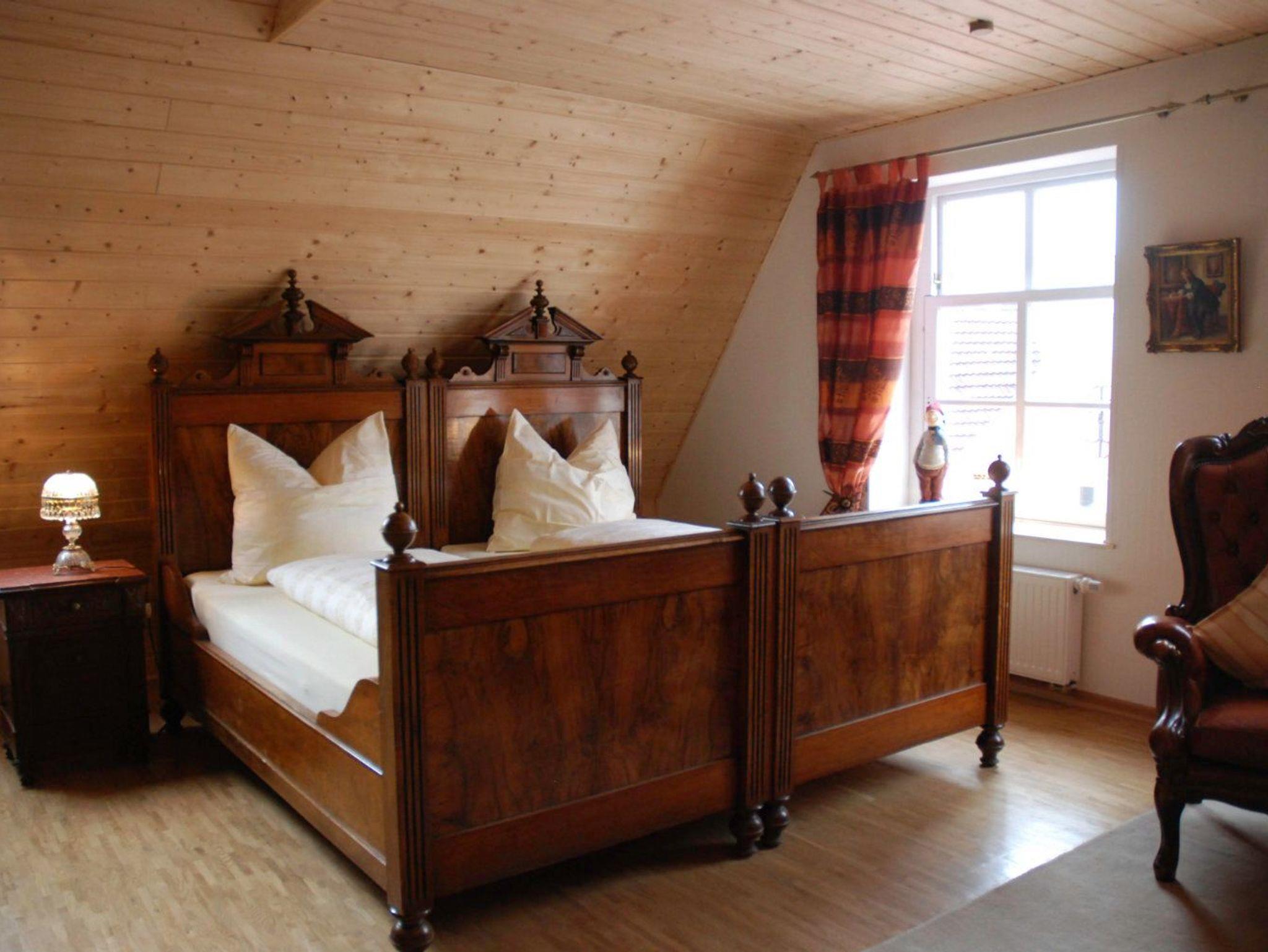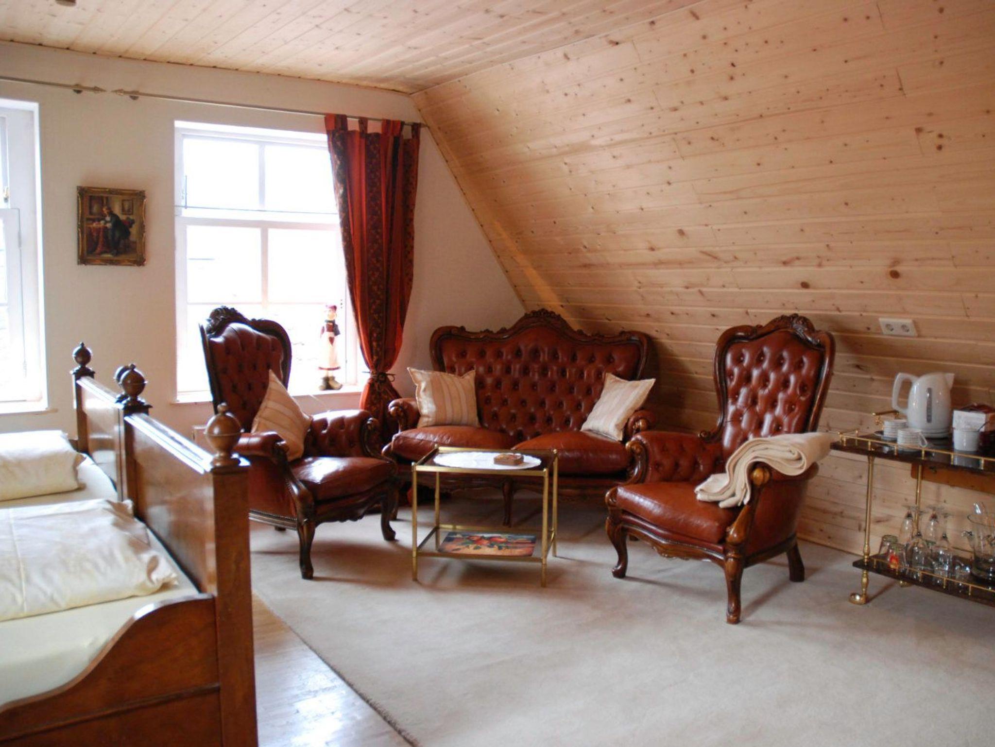Die Wohnung Hänsel und Gretel befindet sich im Dachgeschoss des Märchenhauses und ist 45 qm groß. Sie verfügt über ein gemütlichen Wohn- und Schlafbereich mit stilvollen Antiquitäten-Möbeln, einem Doppelbett und einer Schlafempore und einem Bad/WC.