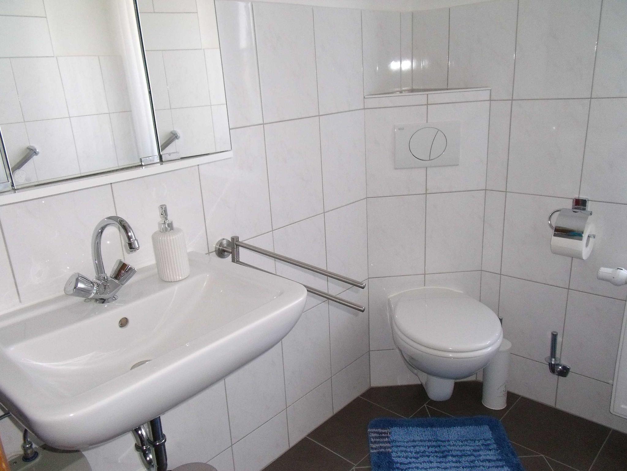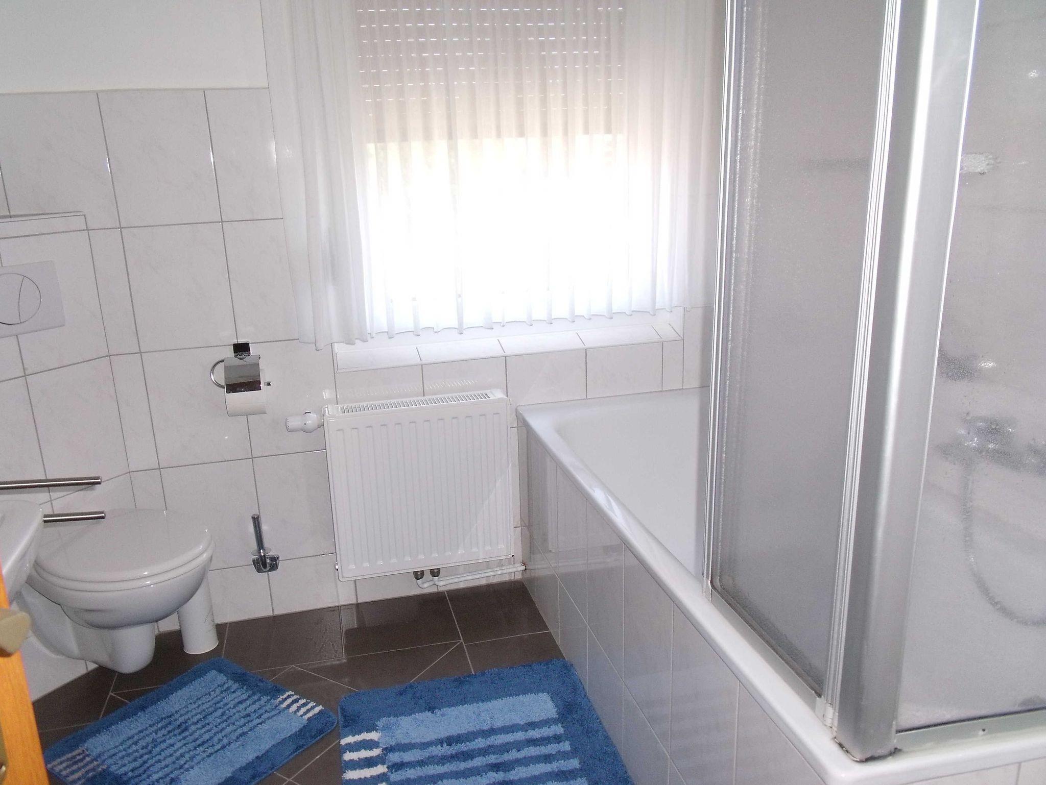 Im Jahr 2012 renoviertes Badezimmer mit Duschbadewanne und WC.