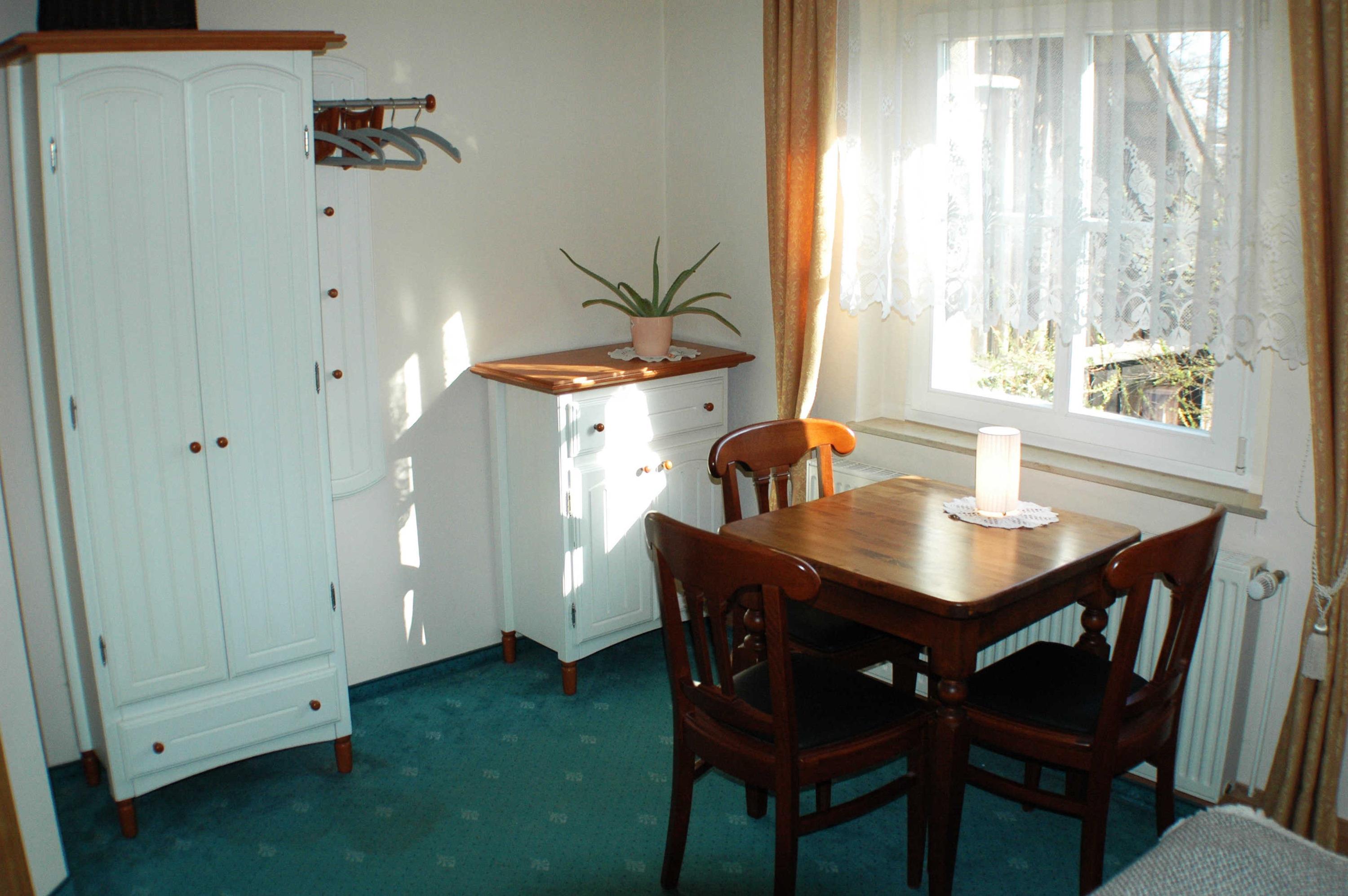 Die Ferienwohnung Schlangenkönig ist auf zwei Etagen verteilt. Im Erdgeschoss befindet sich eine Küchenzeile mit einer kleinen Sitzecke und einem Esstisch für 4 Personen. Die Küche ist ausgestattet mit einem zwei-Platten Induktionsherd, einer Kaffeemaschine, einem Wasserkocher, Toaster und Radio mit CD. Das Wohnzimmer befindet sich im hellen Wintergarten und ist eingerichtet mit gemütlichen Sitzmöbeln, einem Sat-TV und ermöglicht direkten Zugang zur Terrasse. Das erste Schlafzimmer ist offen über die Treppe direkt vom Erdgeschoss aus zu erreichen. Eine Anbauwand sorgt für genügend Stauraum. Angrenzend befindet sich das zweite Schlafzimmer. Es ist eingerichtet mit einem Doppelbett, einer Sitzecke und einem Schrank. Das Badezimmer erreicht man vom Schlafzimmer. Es ist ausgestattet mit einer Dusche, Waschbecken, Toilette, Spiegel und Föhn.