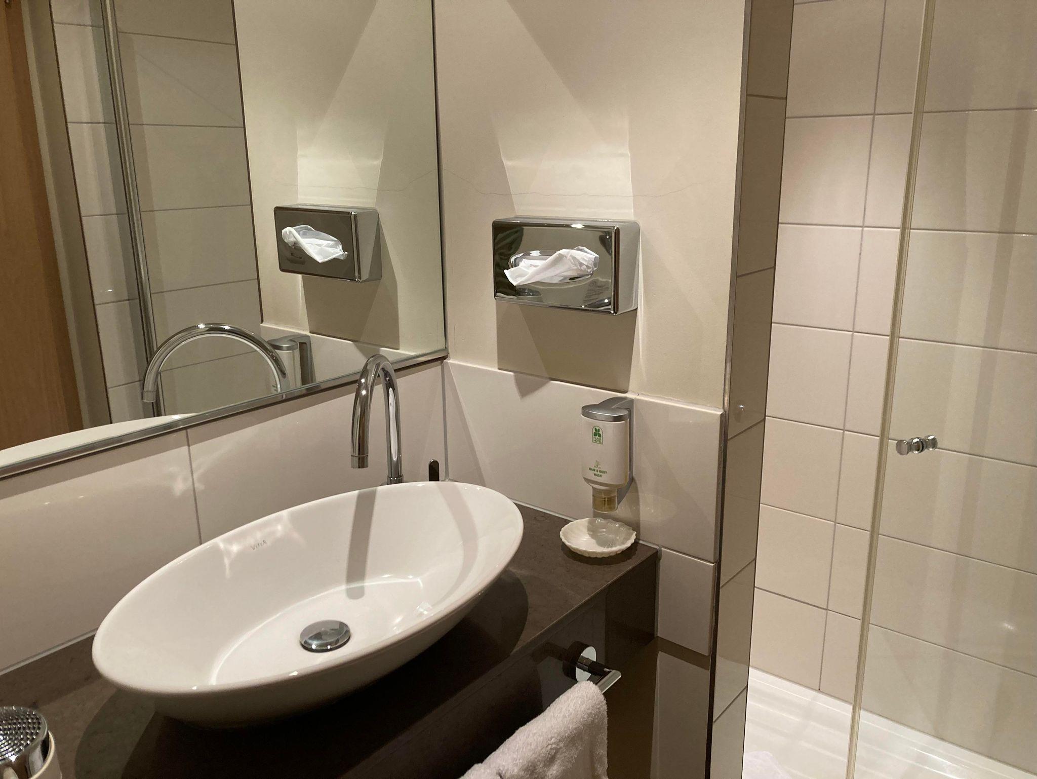 Die Suite hat Wohn- und Schlafzimmer, Dusche und Badewanne. Sie ist modern eingerichtet mit Sofa, Sitzecke und Panoramafenster und sehr ruhig gelegen.