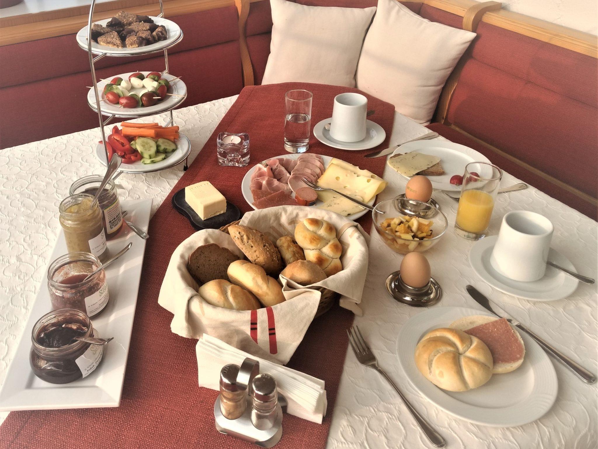 Reichhaltiges Frühstücksbuffet inclusive zweier Kaffeespezialitäten für EUR 9,50 pro Person und ab und zu Abendessen um 18.30 Uhr ebenfalls für EUR 12,- kann vor Ort dazugebucht werden.