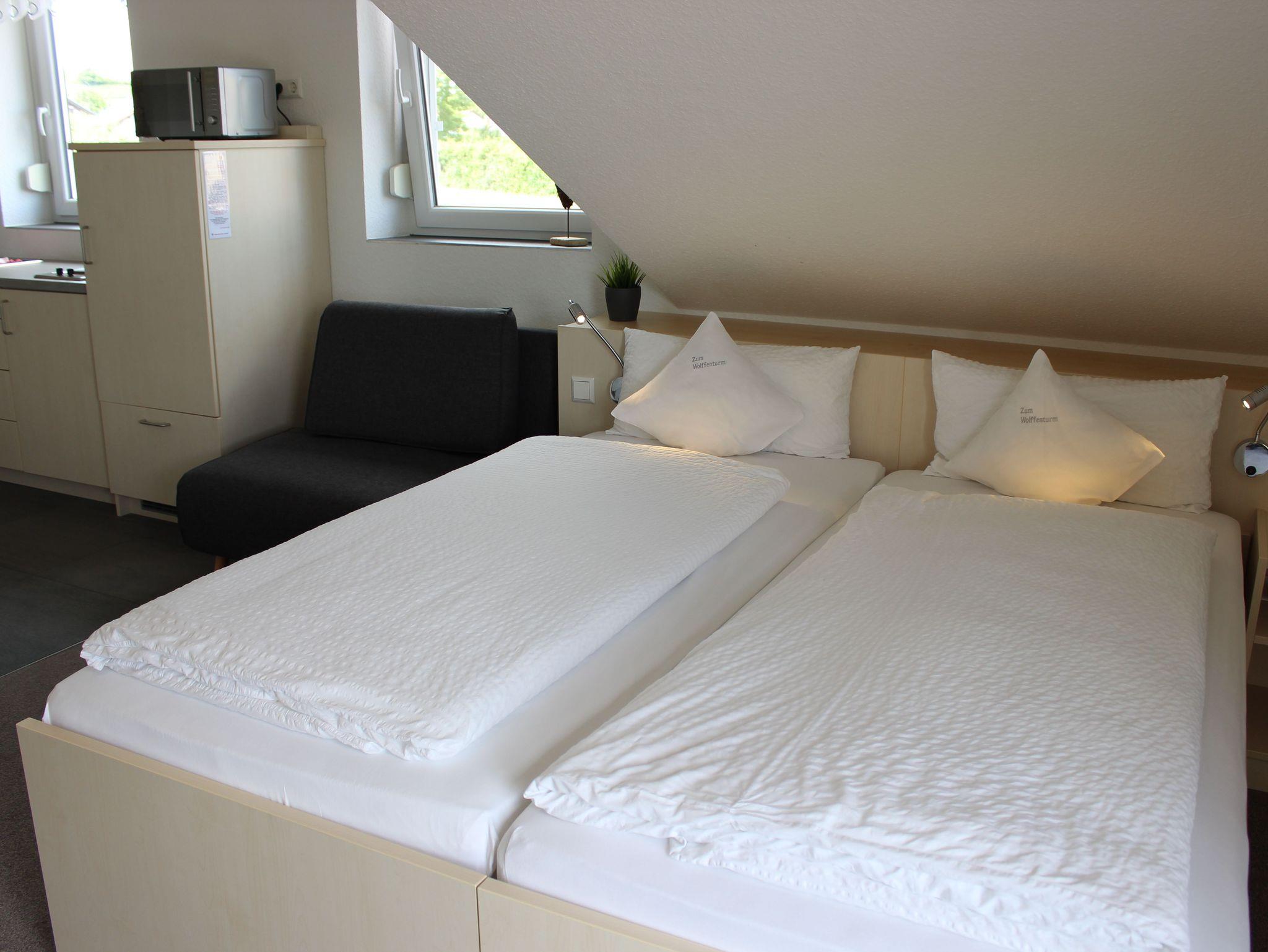 Das Gästehaus „Zum Wolffenturm“ entstand im Jahr 2008 als Neubau mit Gästezimmern und Ferienwohnungen auf dem Forellenhof in Lehrensteinsfeld. Seit 2014 wurden weitere Zimmer und Appartements eingerichtet, wovon einige auch barrierefrei gestaltet sind. Alle Unterkünfte sind mit hellen Holzmöbeln ausgestattet und fast alle Zimmer verfügen über einen Balkon, von dem Sie einen weitläufigen Blick über Wiesen, Wälder und Weinberge genießen können.