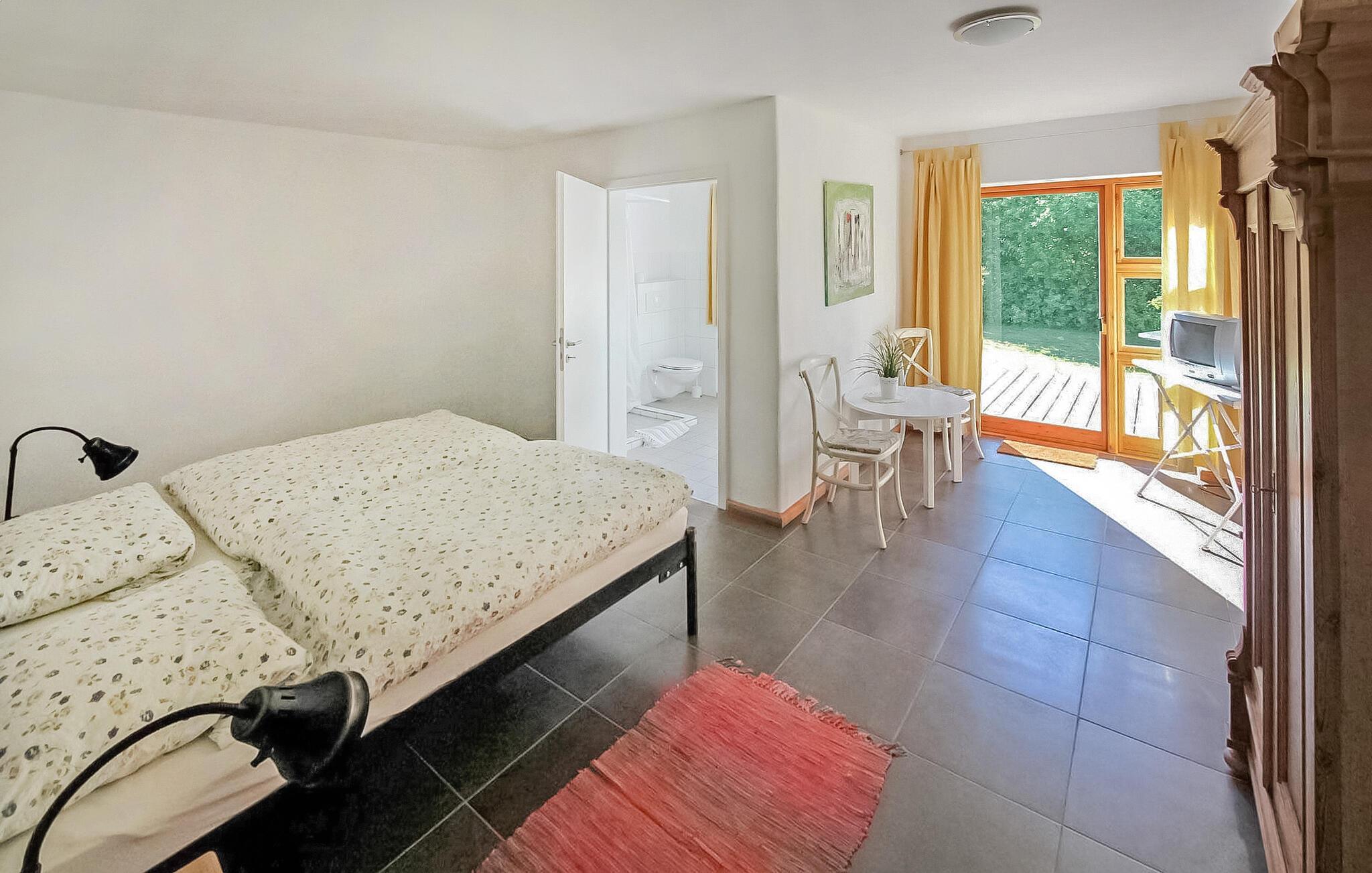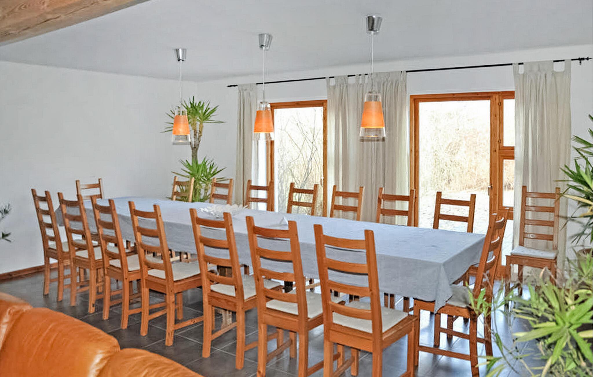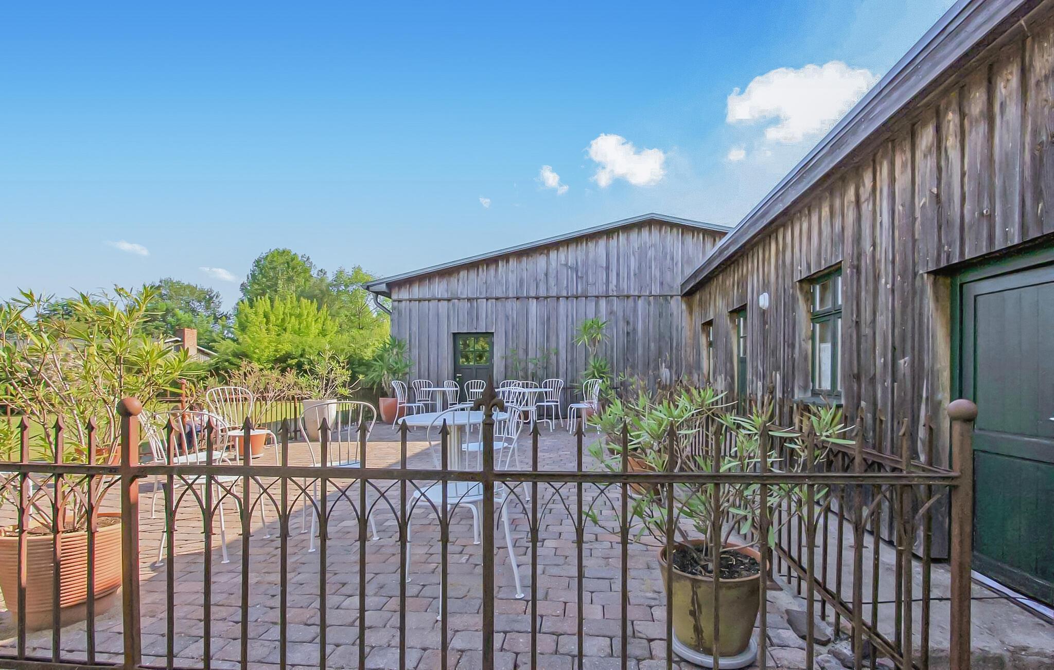 Gruppeejendommen er en del af en tidligere landbrugsejendom og ligger forholdsvis tilbagetrukket på en naturgrund på cirka 25.000 kvadratmeter. På den rummelige grund er der desuden en café, som er midlertidigt åben efter forespørgsel, og en ombygget lade, hvor der blandt andet finder sted kulturelle arrangementer. Ejendommen er ideel til mindre familiefester og grupper på op til 16 personer. Den består af det cirka 40 kvadratmeter store fællesrum med borde, stole og et sofasæt til 8 personer og et stort køkken med el-komfur, ovn, køleskab, opvaskemaskine, diverse små køkkenmaskiner, fade og ekstra siddepladser. En udendørs pejs kan bruges til at grille på den tilstødende store terrasse. Der er i alt 8 dobbeltværelser til rådighed for overnatning, som er udstyret med dobbeltseng, tv og badeværelse med bruser/toilet Fire værelser har desuden egen terrasse og er handicapvenlige. Der er tilstrækkelige parkeringspladser og forskellige siddepladser i den smukke, store have til rådighed for alle gæster. Der er også sauna og fysioterapifaciliteter på stedet, hvor der kan bestilles en række behandlinger. Den samlede pris inkluderer sengelinned, håndklæder, vand- og energiforbrug samt slutrengøring. Lehsten er en lille by midt i Mecklenburg Lake District, kun omkring 17 km fra Waren (Müritz) spa. Den skovklædte region er en populær destination, især for aktive feriegæster som vandrere og cyklister. Vandsportsentusiaster og lystfiskere får noget for pengene ved de mange søer. Fra Lehsten til den næste sø, Varchentin-søen, er der omkring 4 km. De nærmeste butikker, en restaurant og et bageri ligger 3 km derfra. Der er omkring 18 km til banegården, og der er en motorvejsforbindelse omkring 40 km. Mange kulturelle begivenheder finder sted i byen hvert år.I nærliggende Waren (Müritz), turistcentret i Mecklenburg Lake District, er der forskellige seværdigheder og attraktioner, såsom havnen, den historiske gamle bydel eller Müritzeum ferskvandsakvariet. Båd- og cykeludlejning, passagerbådsture, caféer, restauranter og forskellige indkøbsmuligheder er også placeret i byen.