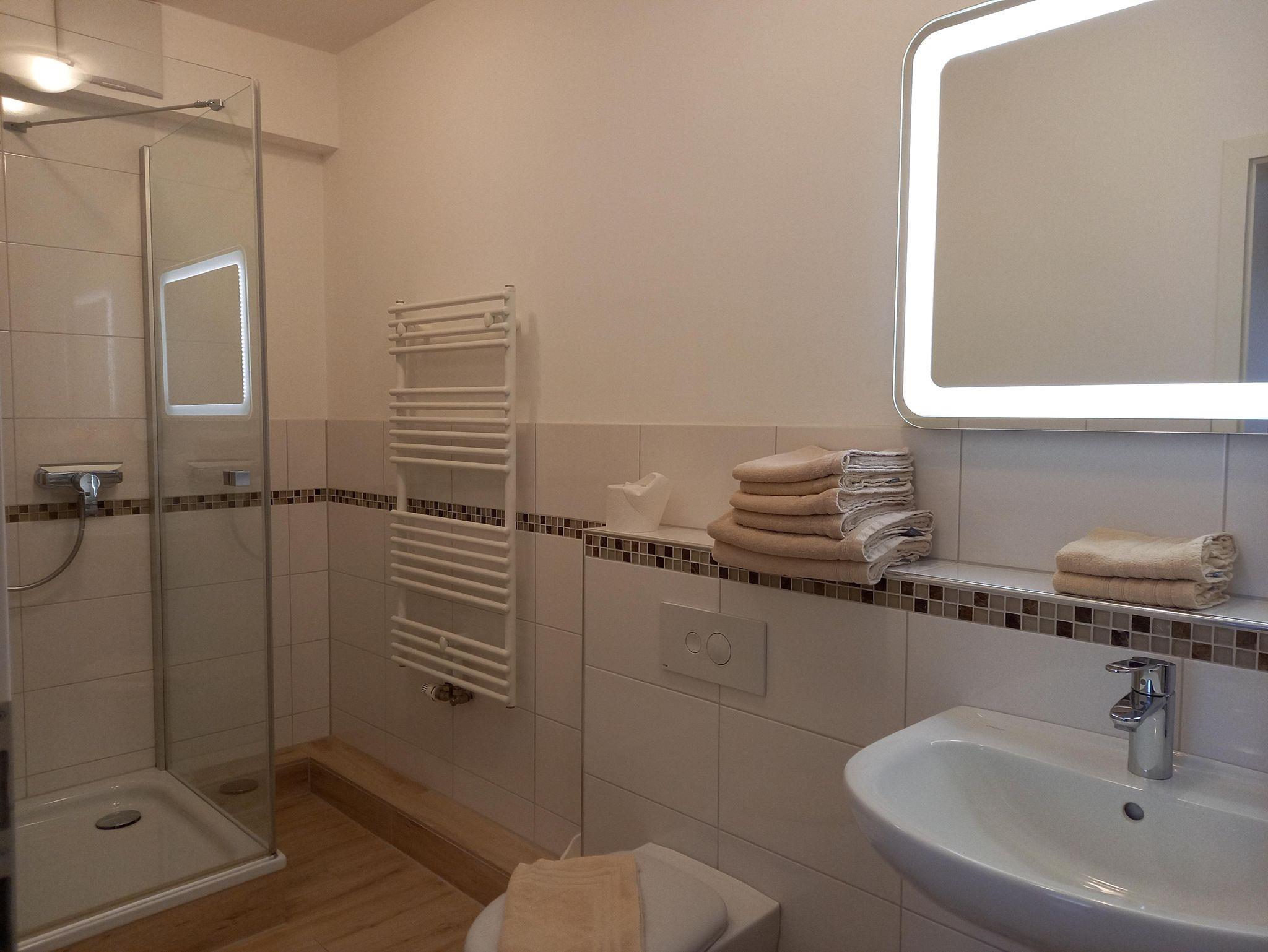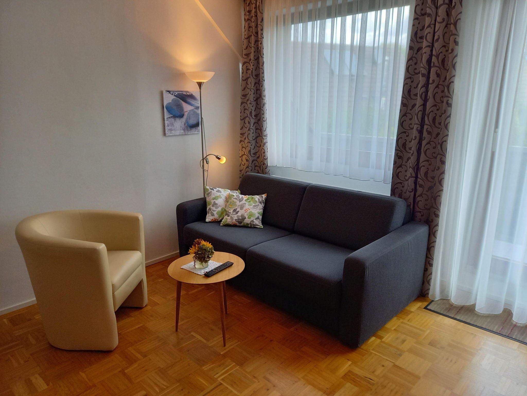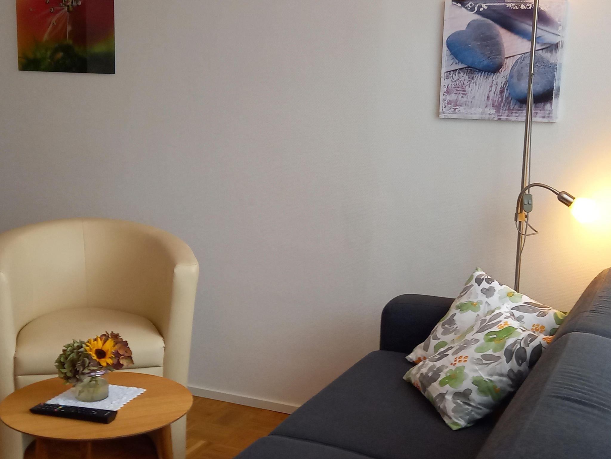 Unsere Ferienwohnung ist ca. 40 m² groß und modern eingerichtet. Der Wohnraum ist mit einem Sofa, Couchtisch, Sessel, Fernseher sowie einem Eßtisch und einer Küchenzeile ausgestattet. Der Balkon hat den Zugang vom Wohnraum aus. Das Schlafzimmer verfügt über einen Kleiderschrank und zwei Einzelbetten und Sie gelangen von dort in das Duschbad. Die Wohnung ist ideal für 2 Personen, aber auch für 2 Erwachsenen mit 1 Kind geeignet. Das Sofa im Wohnraum kann aufgeklappt werden und bietet einen bequemen Schlafplatz. Die Handhabung des Sofas ist sehr einfach, so dass es leicht zum Bett ausgeklappt und tagsüber ebenso leicht wieder zum Sofa werden kann Die Küchenzeile ist mit einem Kühlschrank und einem 2-Platten-Ceranfeld ausgestattet. Außerdem stehen Ihnen 1 Kaffeemaschine, ein Wasserkocher und eine Mikrowelle mit umfassenden Funktionen zur Verfügung. . Bettwäsche und Handtücher sind im Übernachtungspreis enthalten.