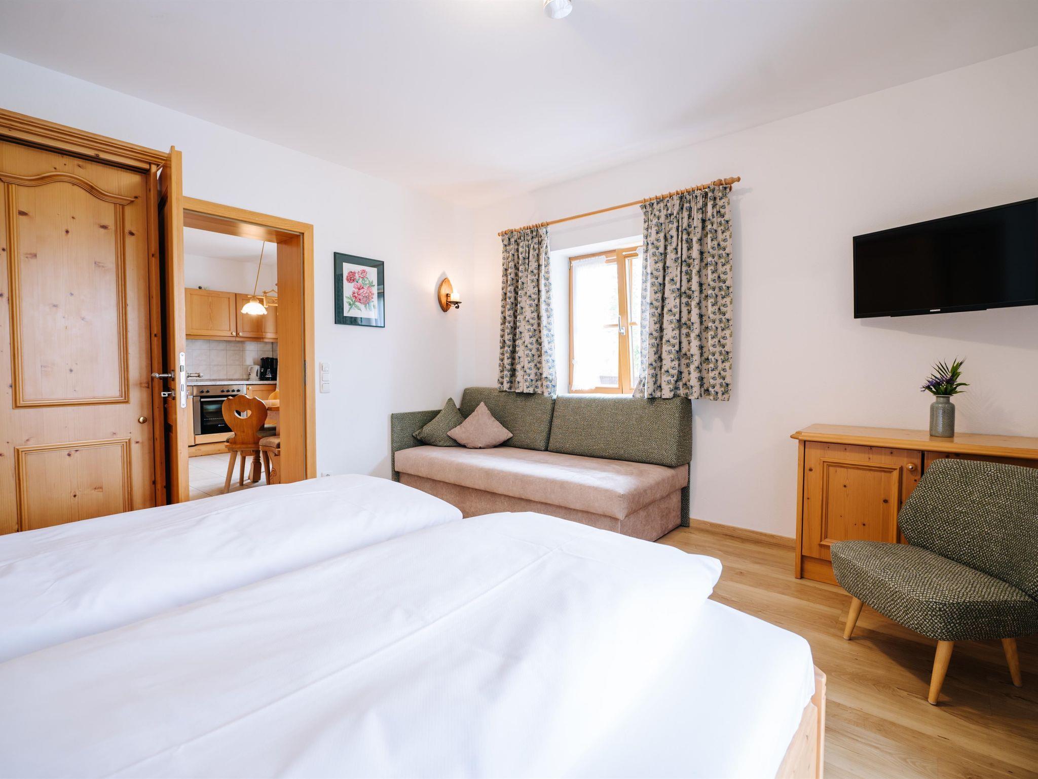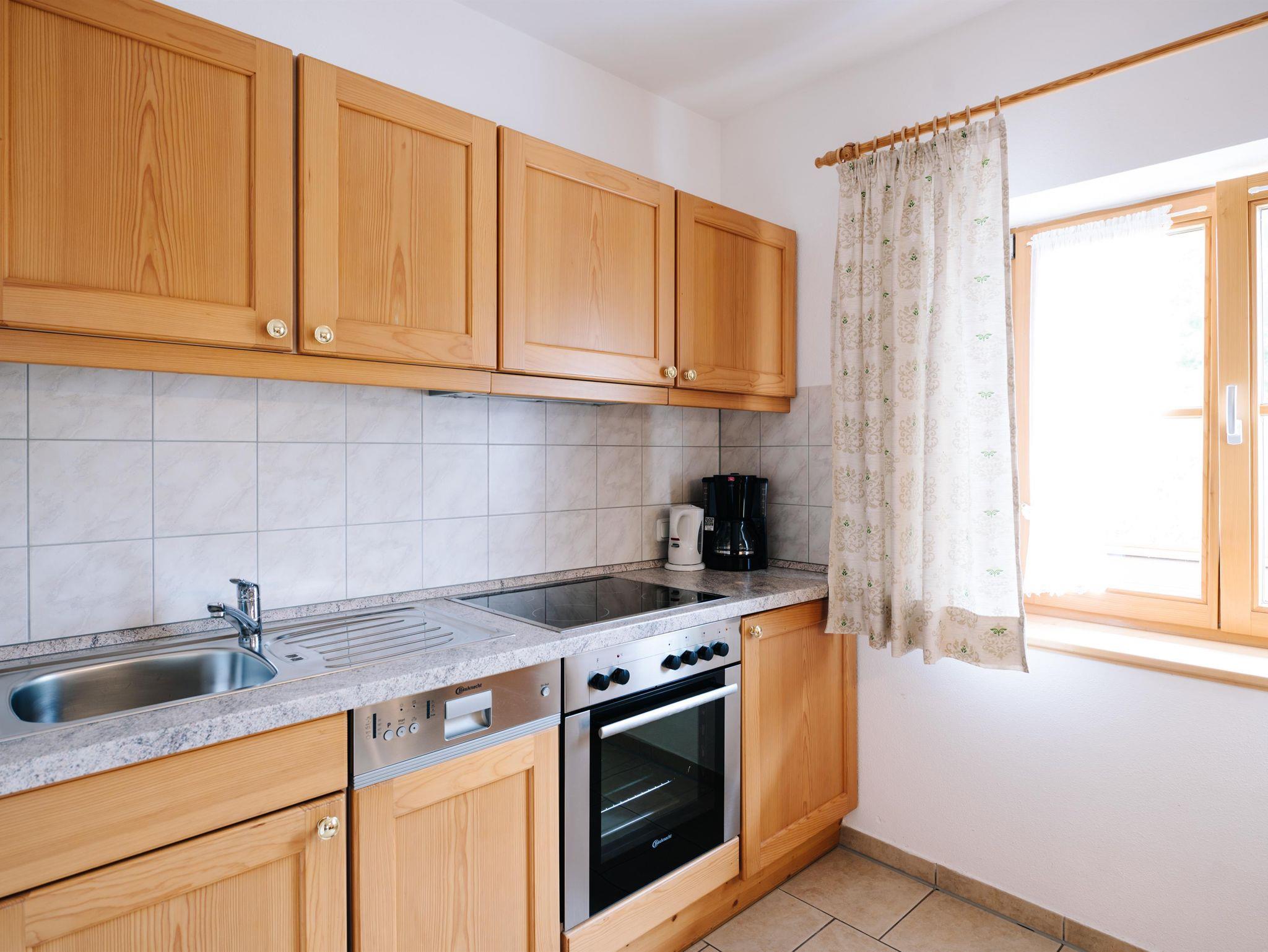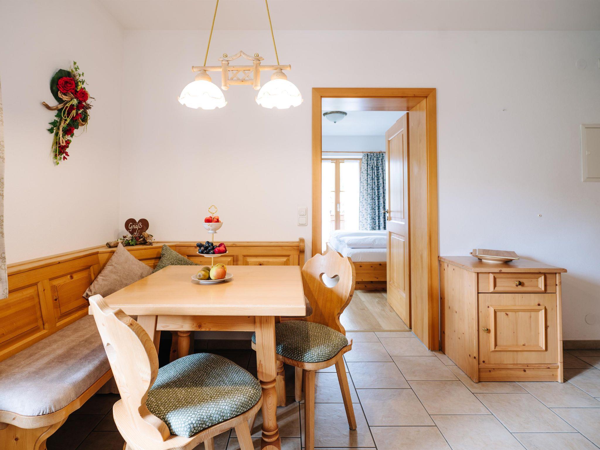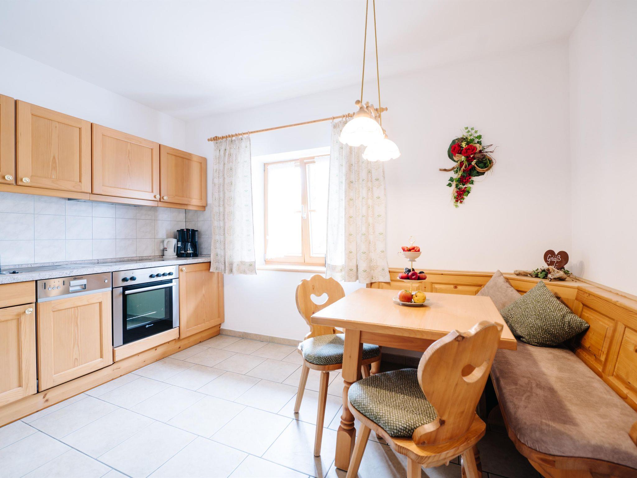 4-Sterne Fewo im bäuerlichem Landhausstil eingerichtet. Die Wohnung verfügt über eine Wohnküche mit gemütlicher Sitzecke, ein Schlafzimmer für zwei Personen und ein Bad mit Dusche/WC. Die Fewo ist ausgestattet mit Balkon, Sat-TV, Radio, Spülmaschine, E-Herd mit Backofen und einen Kühlschrank mit Gefrierfach.