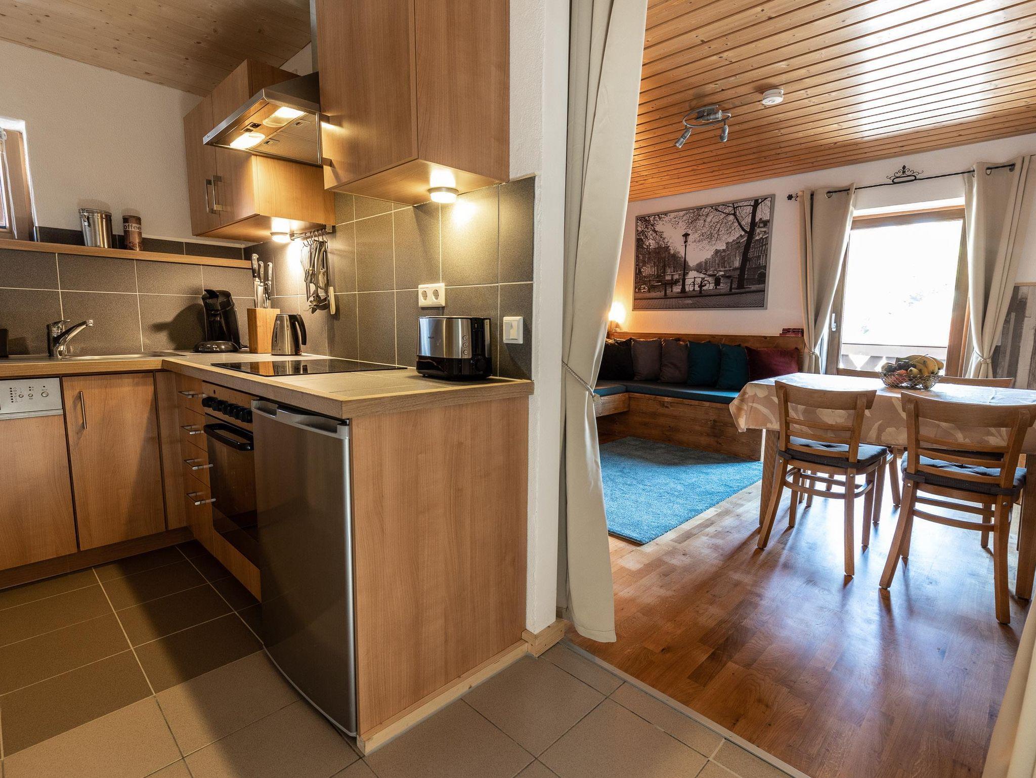 Vollausgestattete Küche mit Spülmaschine, Kühlschrank, Wasserkocher, Toaster, Kaffeemaschine, Backofen, Ceranfeld