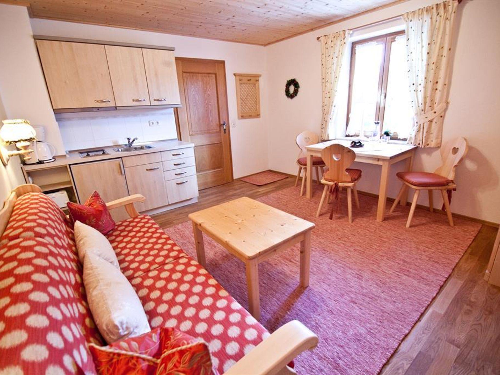 Herzlich willkommen in der Ferienwohnung „Karwendel“ – Ihrem gemütlichen Erholungsort für zwei bis drei Personen in den Bayerischen Alpen. Auf 44 m² erwarten Sie eine moderne Ausstattung mit Massivholzmöbeln und liebevollen Details. Ein separates Schlafzimmer mit Doppelbett und ein Wohnbereich mit Schlafsofa bieten Komfort für Paare oder kleine Familien. Die Küche ist mit Spülmaschine, Herd, Backofen, Kaffeefiltermaschine, Wasserkocher und Toaster bestens ausgestattet. Das Bad verfügt über Dusche, WC und Föhn. WLAN, Flachbild-TV, Bettwäsche sowie Hand- und Geschirrtücher (Wechsel ab der 2. Woche) sind inklusive. Der Essbereich und der überdachte Südwestbalkon bieten einen herrlichen Blick auf Berge und Wiesen – ideal für entspannte Stunden.