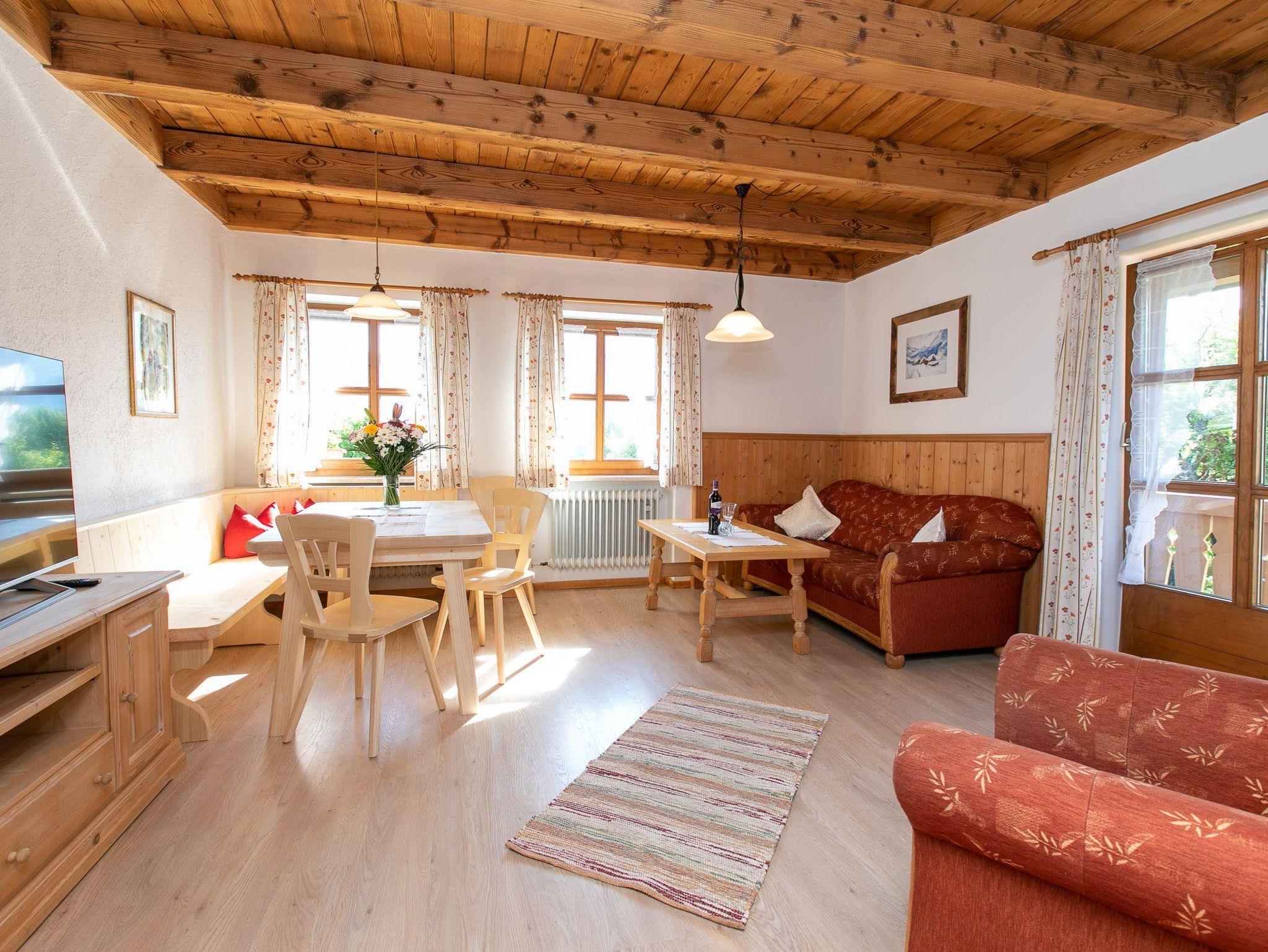 Mit ca. 70 qm Wohnfläche umfasst sie zwei getrennte Schlafzimmer, Wohnzimmer mit Couch und Essecke, Küche mit Spülmaschine, Flur, große Dusche/WC und Balkon über die Vorderseite unseres Bauernhofes mit herrlichem Ausblick auf Lenggries.