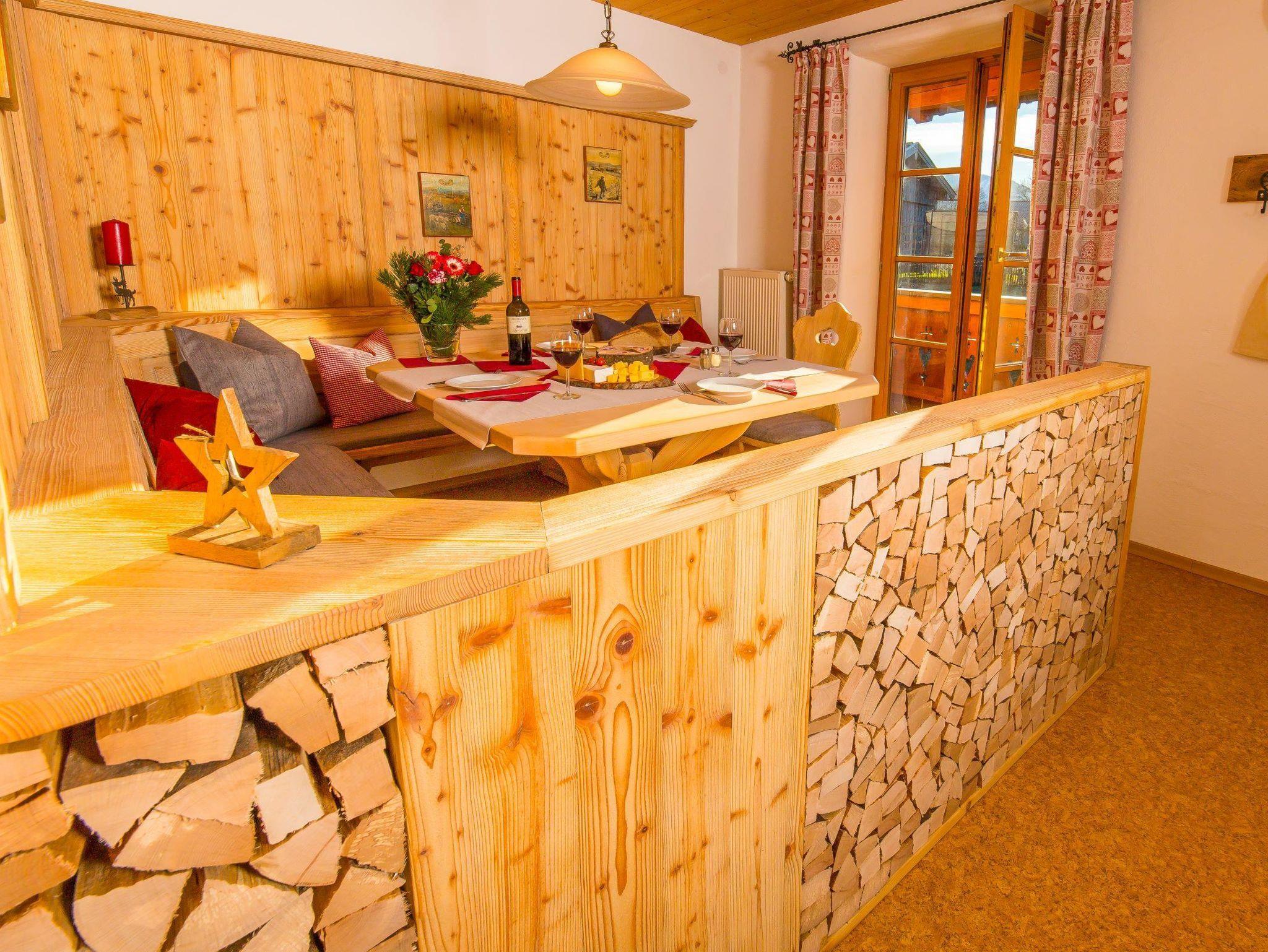 Komplett ausgestattete Wohnküche, Kamin mit kostenl. Feuerholz, urige Eckbank mit großem Tisch.