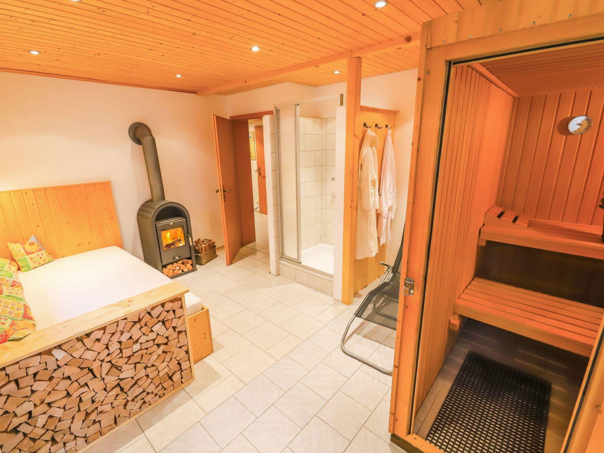 Auf Wunsch mietbarer Saunabereich zur Alleinnutzung, Ruheraum und Kamin mit Feuerholz, pro Person/Tag € 10,00.